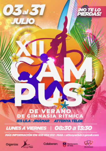 El Club Attenya Telde de gimnasia rítmica prepara la XII edición de su Campus de Verano, que se llevará a cabo del 3 al 31 de julio en Jinámar, en las instalaciones del IES Lila. Se desarrollará de lunes a viernes en horario de 08.30 a 13.30.