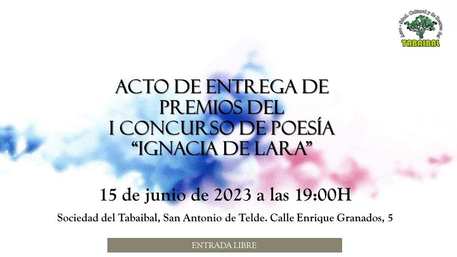 La Sociedad Cultural y de Recreo El Tabaibal de San Antonio celebrará este jueves, 15 de junio, el acto de entrega de premios de su I Concurso de Poesía Ignacia de Lara. Será a partir de las 19.00 horas en la sede de la entidad, en el número 5 de la calle Enrique Granados.