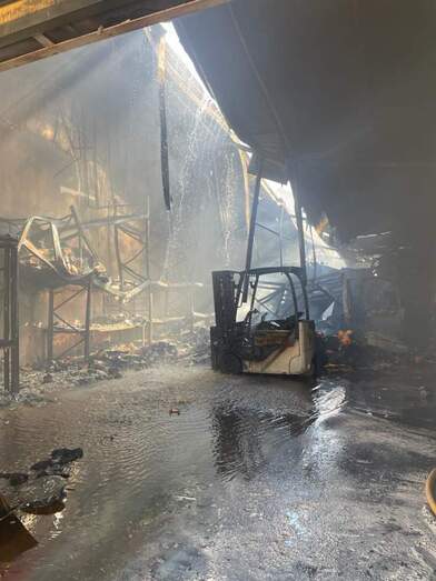 Imagen del incendio/TA.Sobre las seis de la mañana de este sábado se recibió el aviso en Bomberos de Las Palmas de Gran Canaria de un incendio en las instalaciones de Mercalaspalmas y en torno a las 11.00 horas se daba por controlado, si bien durante horas se continuó refrescando la zona afectada.