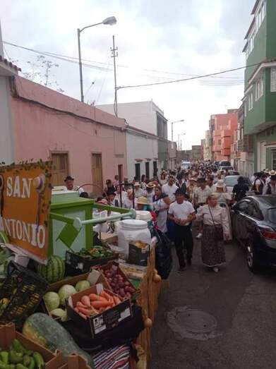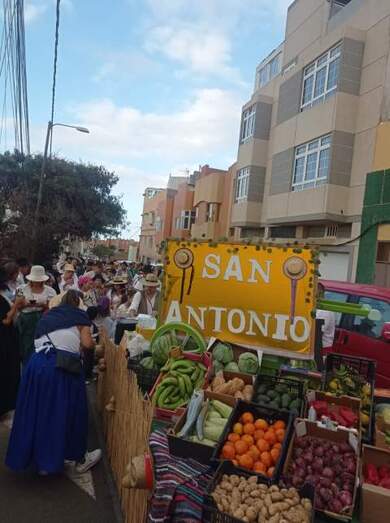 Las carretas cargadas de productos de la tierra partieron del inicio de la calle de Tabaibal y recorrieron las vías de Portada y Alto de los Leones hasta encontrarse con la carretera general de La Pardilla, a la altura del almacén municipal, donde tomaron dirección hacia la ermita de San Antonio.