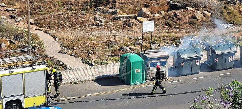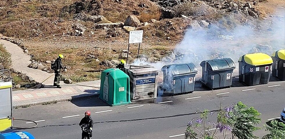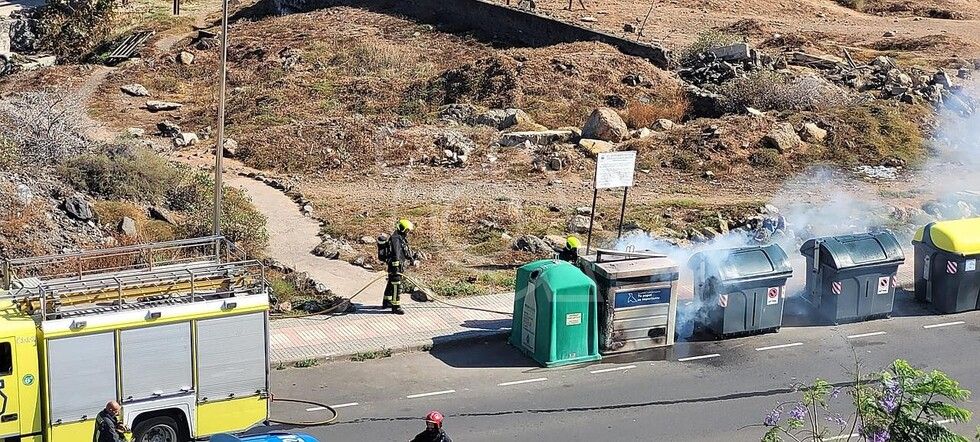 Bomberos del parque zonal de Telde extinguieron hace unos 20 minutos un incendio en un contenedor destinado a la recogida selectiva de papel y cartón  situado en las  ramblas de Pedro Lezcano, en el sector de Los Picachos de Los Llanos.