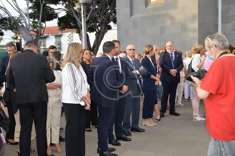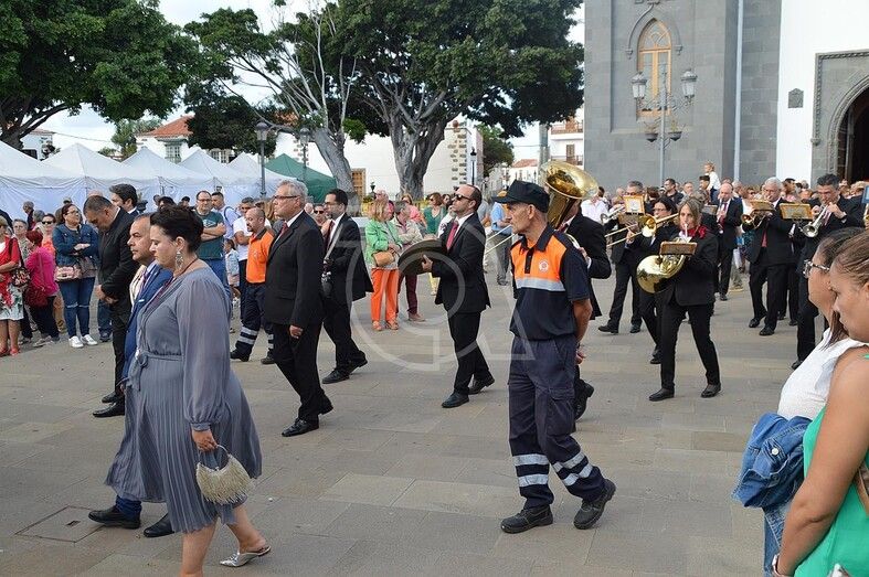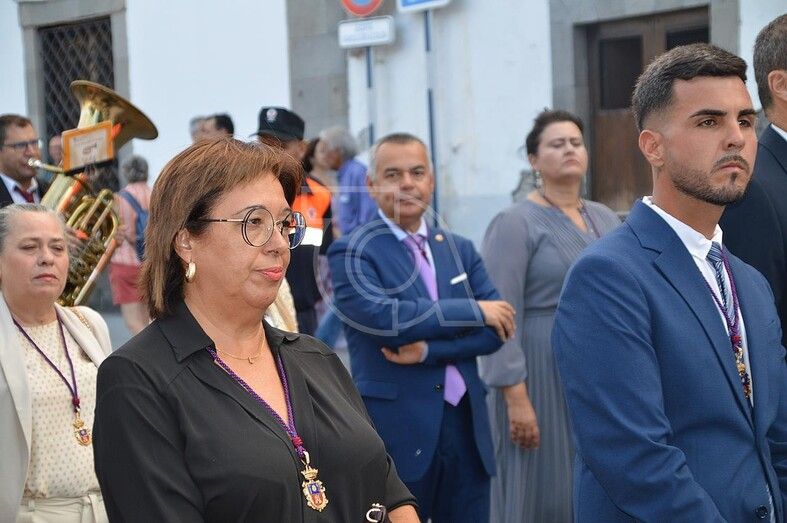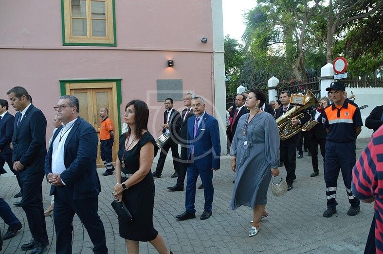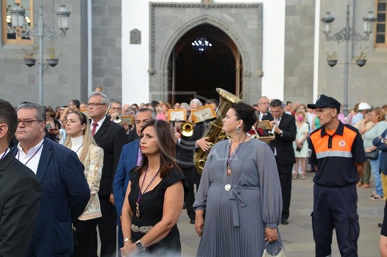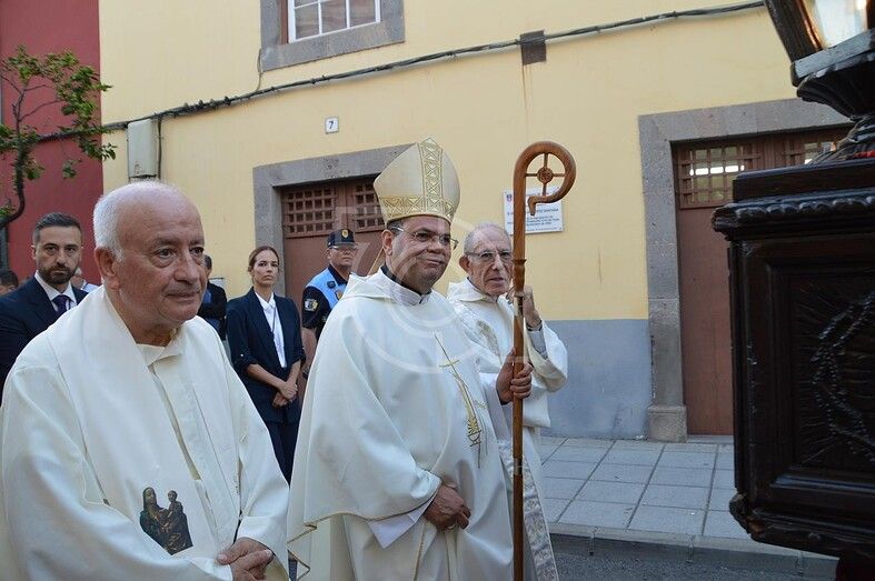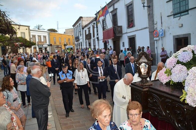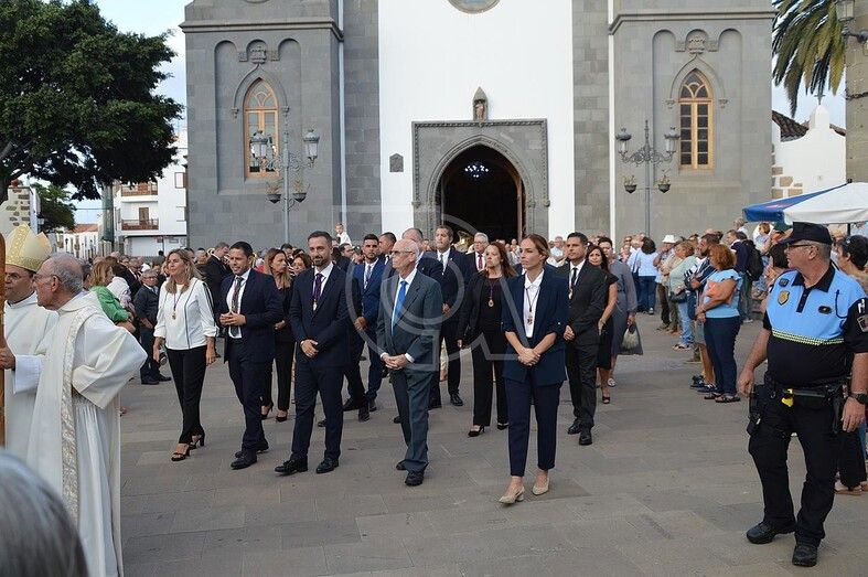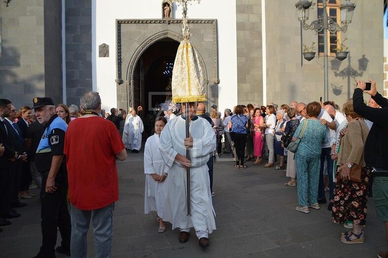 En la segunda procesión religiosa tras el parón de casi dos años y medio motivado por la pandemia, la venerada imagen asomaba por el pórtico principal de la Basílica de Telde pasadas las 20.15 horas, tras finalizar la solemne misa oficiada por el obispo auxiliar de la Diócesis de Canarias, Cristóbal Déniz, y el sacerdote y párroco José María Cabrera. La eucaristía estuvo amenizada por Mari Carmen Hernández y su coro.