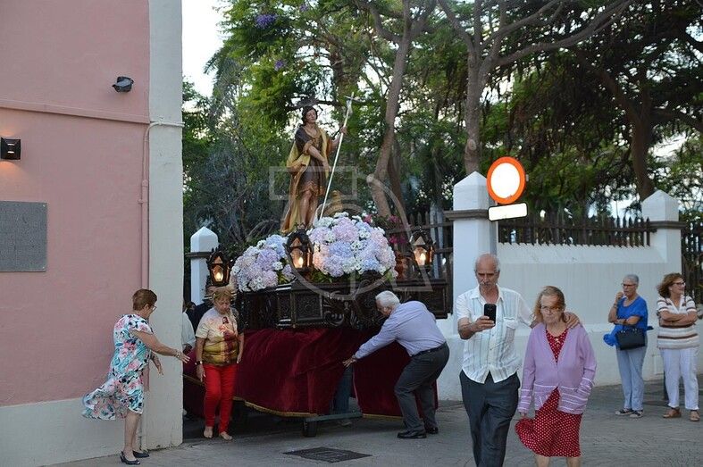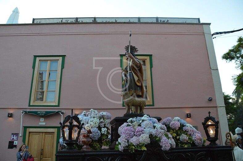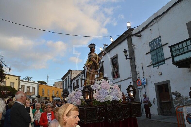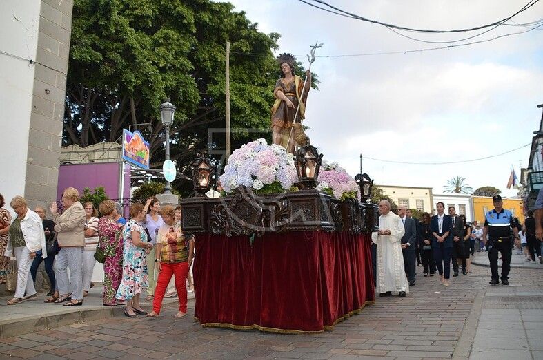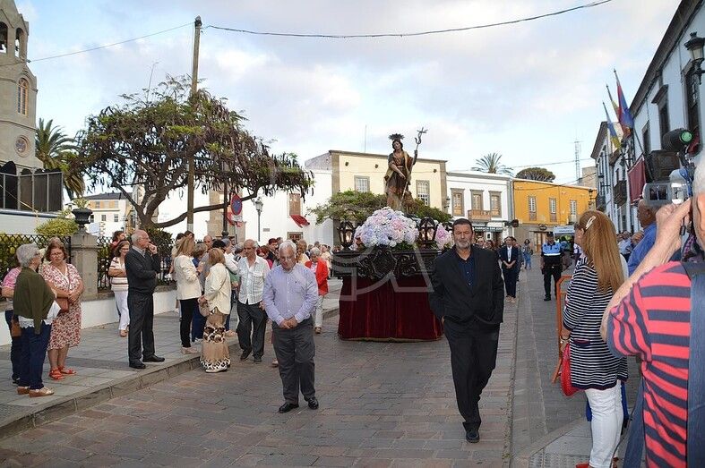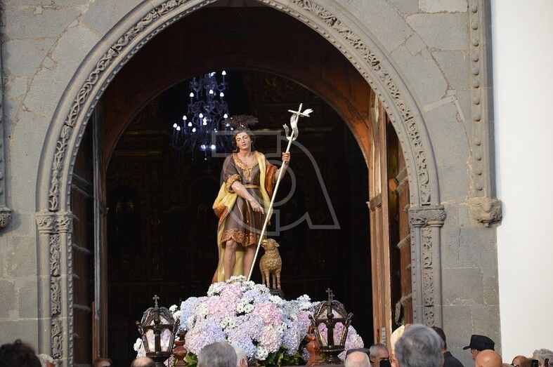 Luciendo una preciosa composición de flor de mundo, obra del artista y diseñador Segundo Amador, el trono de San Juan Bautista, patrono de la ciudad, recorrió esta noche las calles del casco histórico de Telde con el acompañamiento de un nutrido grupo de feligreses, Banda Municipal de Música y autoridades encabezadas por el nuevo alcalde Juan Antonio Peña (Ciuca).