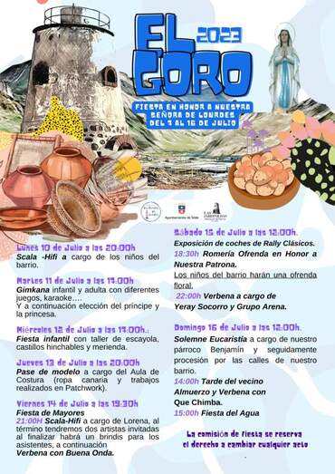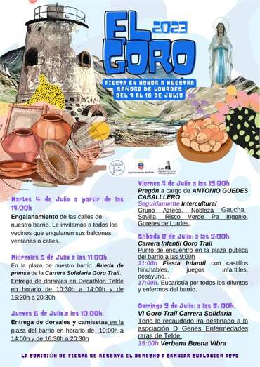 El barrio de El Goro se prepara para celebrar sus fiestas patronales en honor a Nuestra Señora de Lourdes del 7 al 16 de julio. Los fastos arrancan este viernes con el pregón a cargo de Antonio Guedes Caballero a las 19.00 horas, seguido por la actuación del Grupo Azteca, Nobleza Gaucha, Sevilla, Risco Verde Pa Ingenio y Goretes de Lourdes.