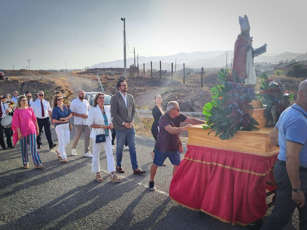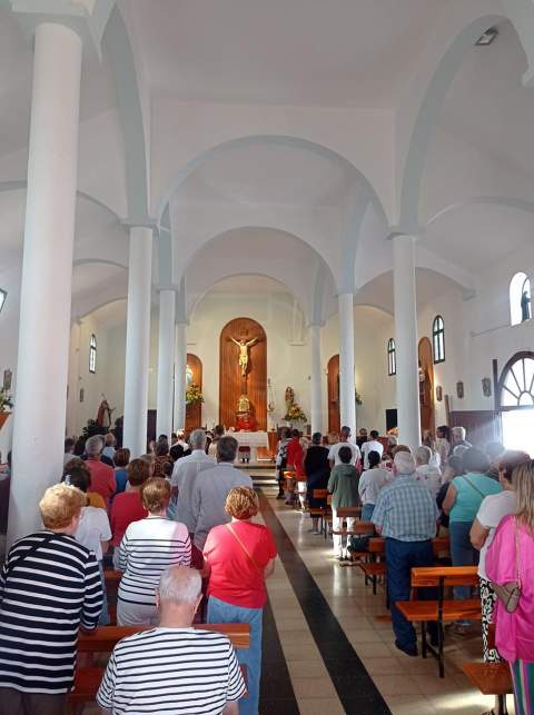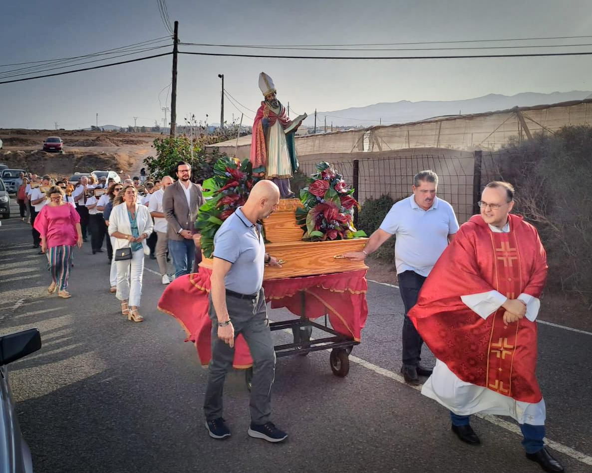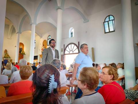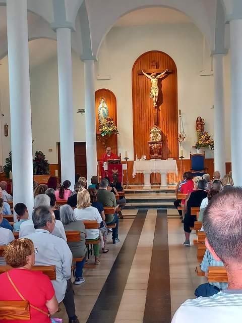 Tras la ofrenda tuvo lugar una misa oficiada por el párroco de la zona, Benjamín Ramírez, y su término la procesión del trono de San Fermín por las calles próximas al templo, un desfile religioso que estuvo amenizada por la Banda Municipal de Música y que contó con la presencia del vicealcalde de la ciudad, Sergio Ramos, y de la concejala María González Calderín, estrechamente vinculada al barrio y a sus fiestas desde hace años.
