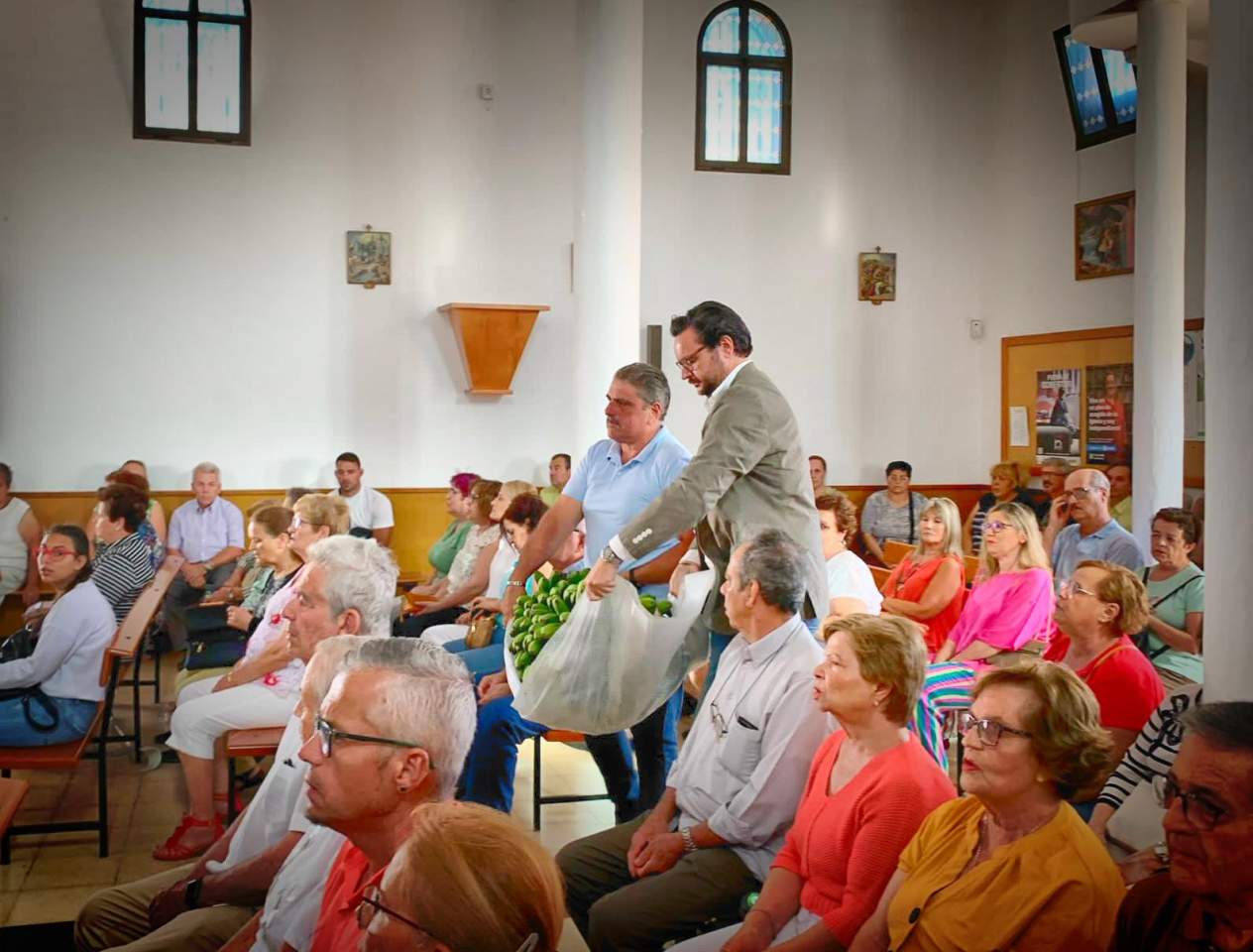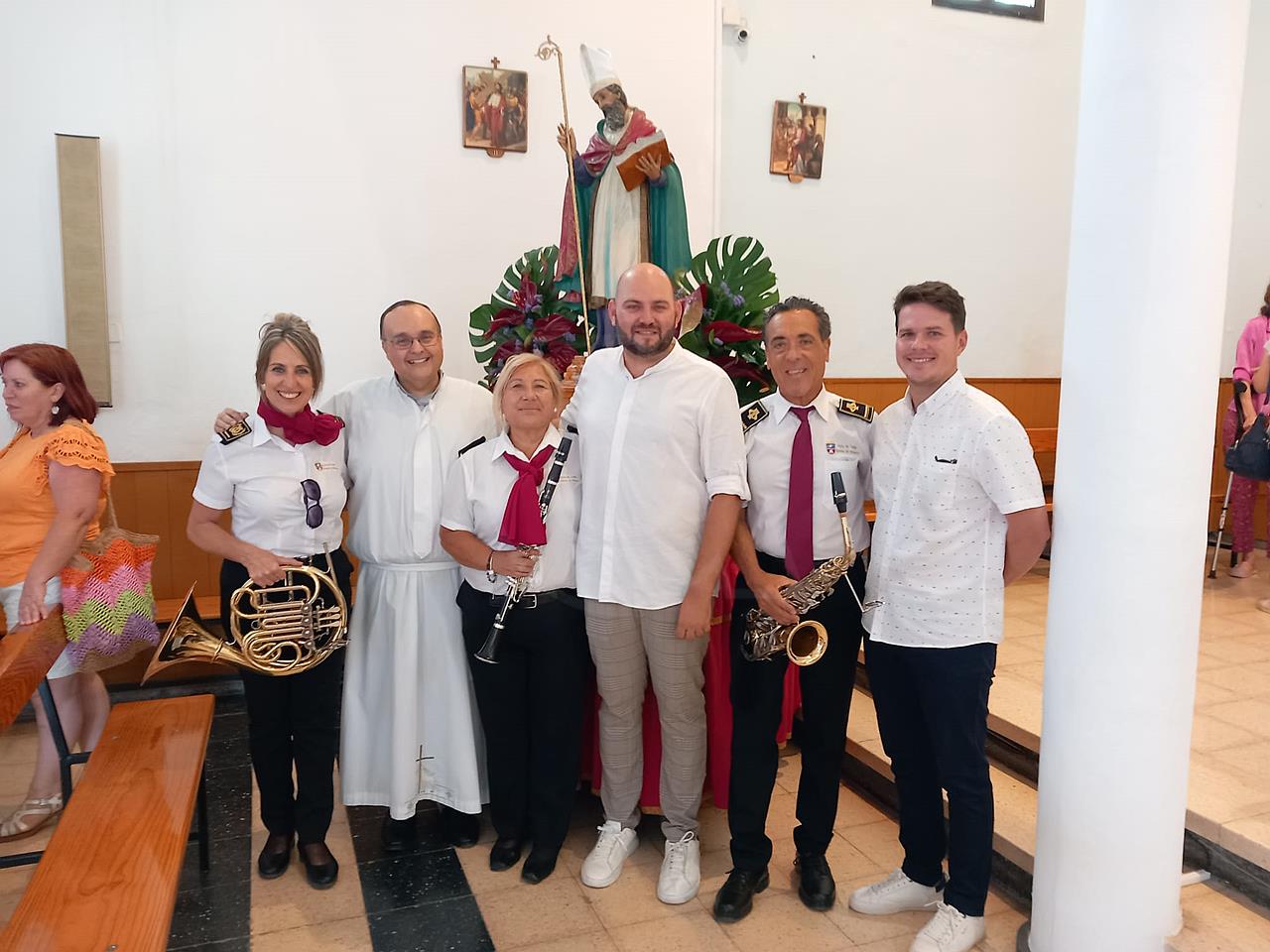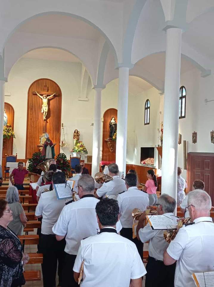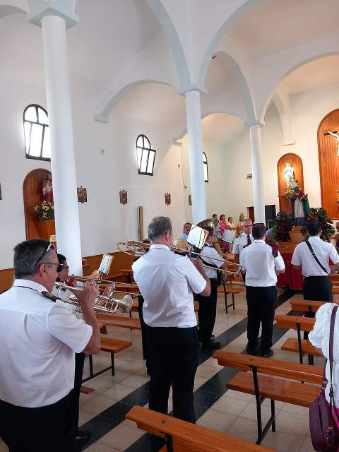 Tras la ofrenda tuvo lugar una misa oficiada por el párroco de la zona, Benjamín Ramírez, y su término la procesión del trono de San Fermín por las calles próximas al templo, un desfile religioso que estuvo amenizada por la Banda Municipal de Música y que contó con la presencia del vicealcalde de la ciudad, Sergio Ramos, y de la concejala María González Calderín, estrechamente vinculada al barrio y a sus fiestas desde hace años.