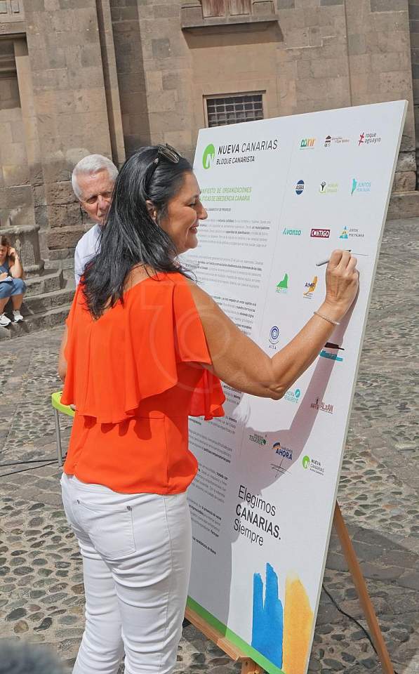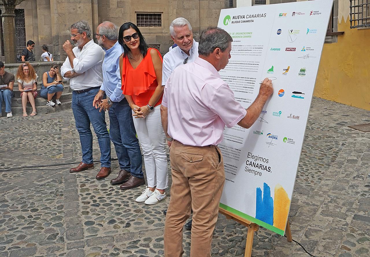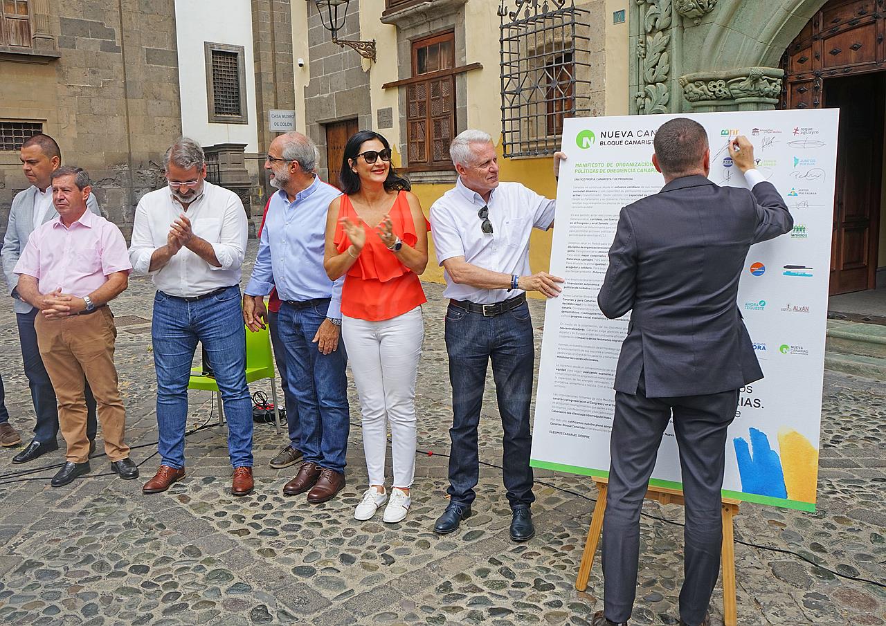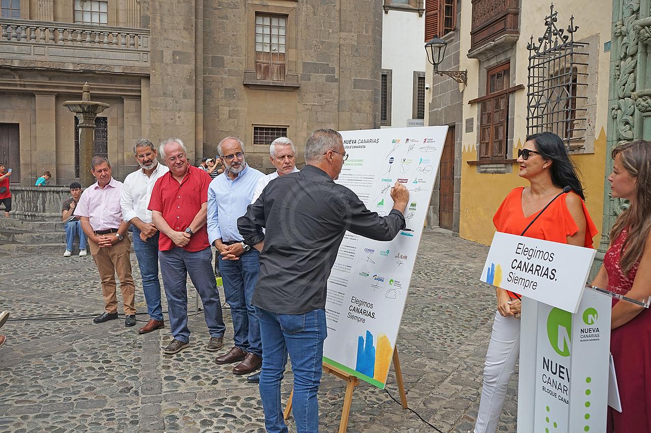 En la emblemática plaza del Pilar Nuevo de Vegueta de Las Palmas de Gran Canaria, como escenario del acto, representantes del Bloque Nacionalista Rural (BNR), Roque Aguayro (RA), la Asociación de Barrios (ASBA), Juntos por Guía (JXG), Alternativa por San Mateo (AxSM), Agrupación de Electores por Tejeda (AET), Compromiso por Firgas (Comfir), Forum Drago (FD), Unión Veguera (UV), Alternativa Local por Antigua (ALxAN), Fuerteventura Avanza (FA), Juntos por Pájara (JxP), Asambleas Municipales de Fuerteventura (AMF), Unidos por Betancuria (UPBE), Contigo, Ahora Tegueste, Agrupación Independiente de El Sauzal (AISA), A’Gara, Hablemos Ahora y Primero Teguise y NC suscribieron un documento de compromisos con las canarias y los canarios para lograr una representación canaria en Madrid libre de tutelas; leído por Carlota Guerra.