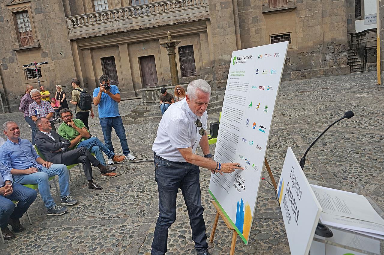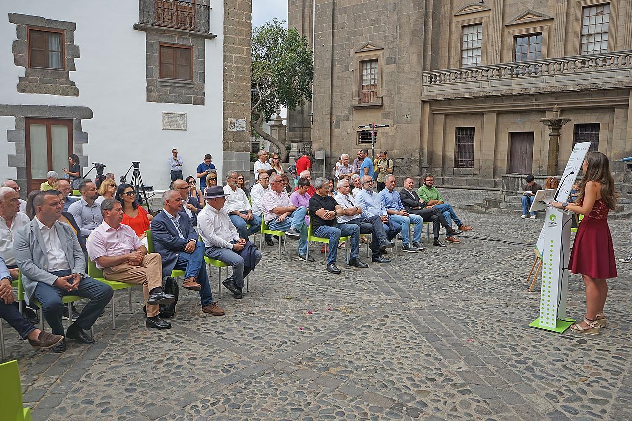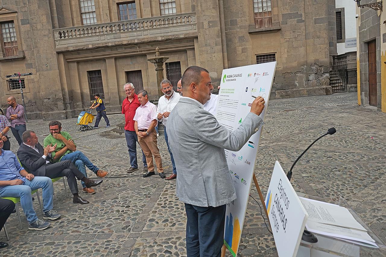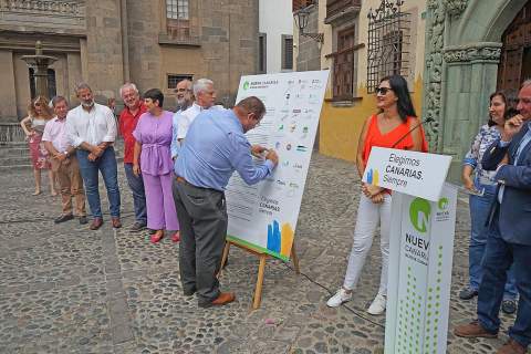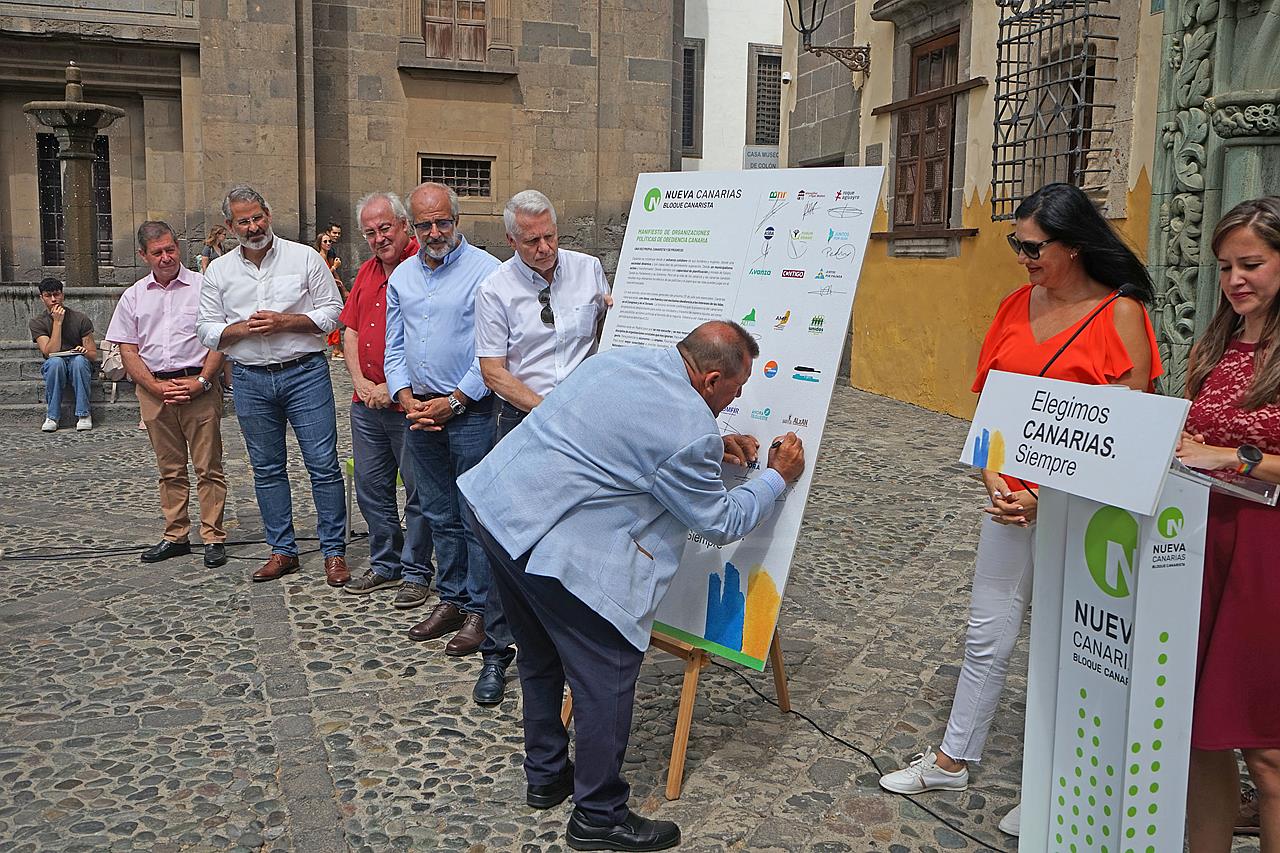 En la emblemática plaza del Pilar Nuevo de Vegueta de Las Palmas de Gran Canaria, como escenario del acto, representantes del Bloque Nacionalista Rural (BNR), Roque Aguayro (RA), la Asociación de Barrios (ASBA), Juntos por Guía (JXG), Alternativa por San Mateo (AxSM), Agrupación de Electores por Tejeda (AET), Compromiso por Firgas (Comfir), Forum Drago (FD), Unión Veguera (UV), Alternativa Local por Antigua (ALxAN), Fuerteventura Avanza (FA), Juntos por Pájara (JxP), Asambleas Municipales de Fuerteventura (AMF), Unidos por Betancuria (UPBE), Contigo, Ahora Tegueste, Agrupación Independiente de El Sauzal (AISA), A’Gara, Hablemos Ahora y Primero Teguise y NC suscribieron un documento de compromisos con las canarias y los canarios para lograr una representación canaria en Madrid libre de tutelas; leído por Carlota Guerra.