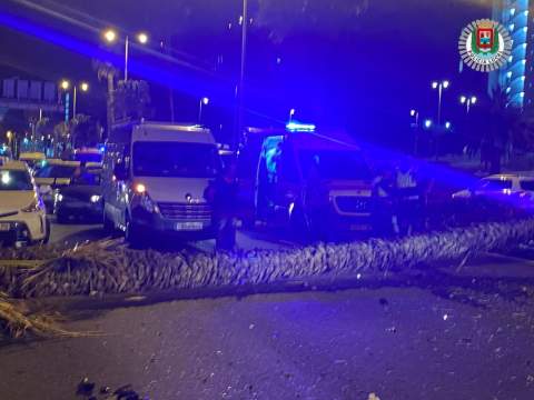 Un cuarto de hora después, sobre las 3.58 horas, se produjo un accidente de tráfico en la avenida marítima en sentido norte, a la altura de la comandancia de la Guardia Civil, cuando un vehículo dio varias vueltas de campana y terminó empotrado contra una palmera.