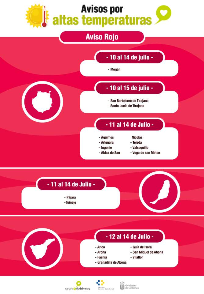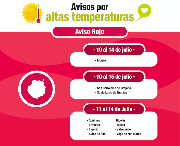 En Gran Canaria, hay aviso rojo (riesgo alto) del 10 al 14 de julio en Mogán; del 10 al 15 de julio en en San Bartolomé de Tirajana y Santa Lucía de Tirajana; del 11 al 14 de julio en Agüimes, Artenara, Ingenio, La Aldea de San Nicolás, Tejeda, Valsequillo y Vega de San Mateo.