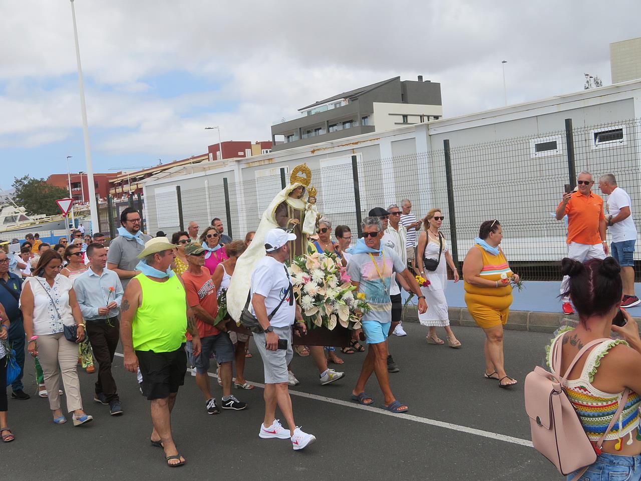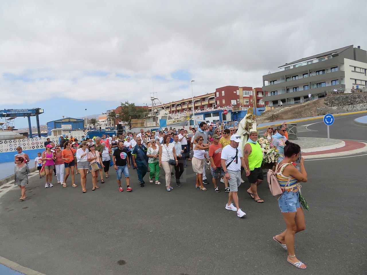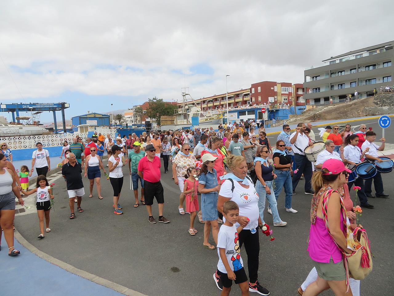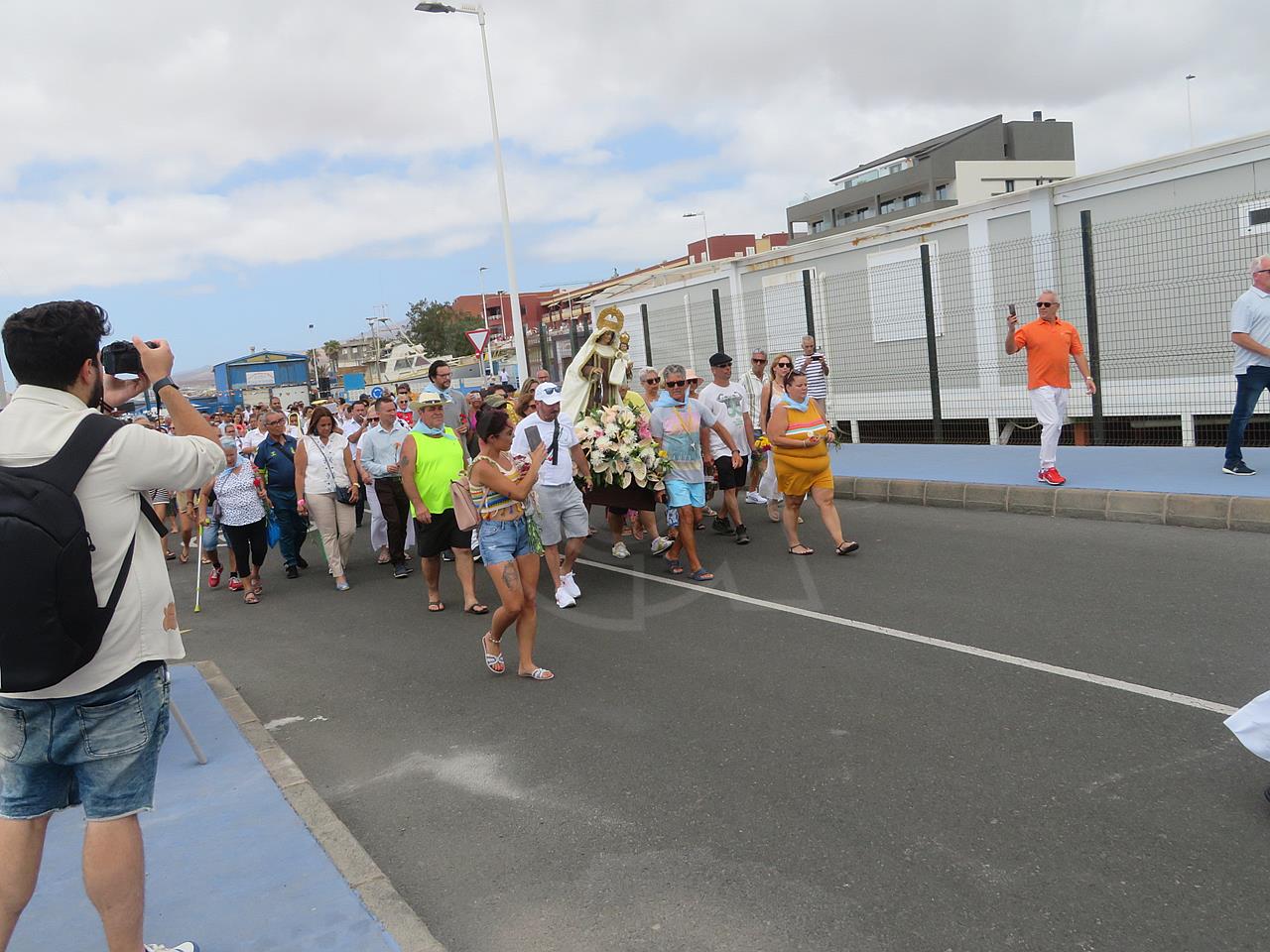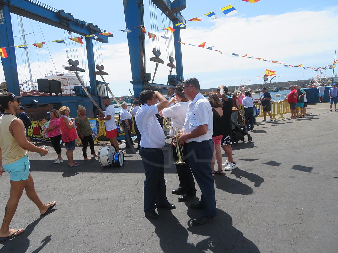Tras la eucaristía, el  pequeño trono con la patrona fue llevado en procesión por el muelle en un recorrido algo más corto del habitual amenizada por la banda de cornetas y tambores Asanpa de La Isleta (Las Palmas de Gran Canaria).