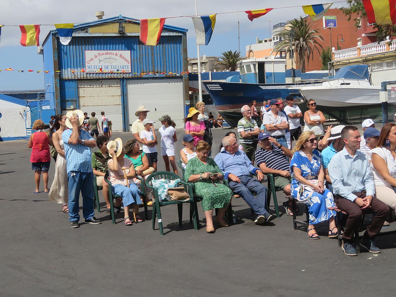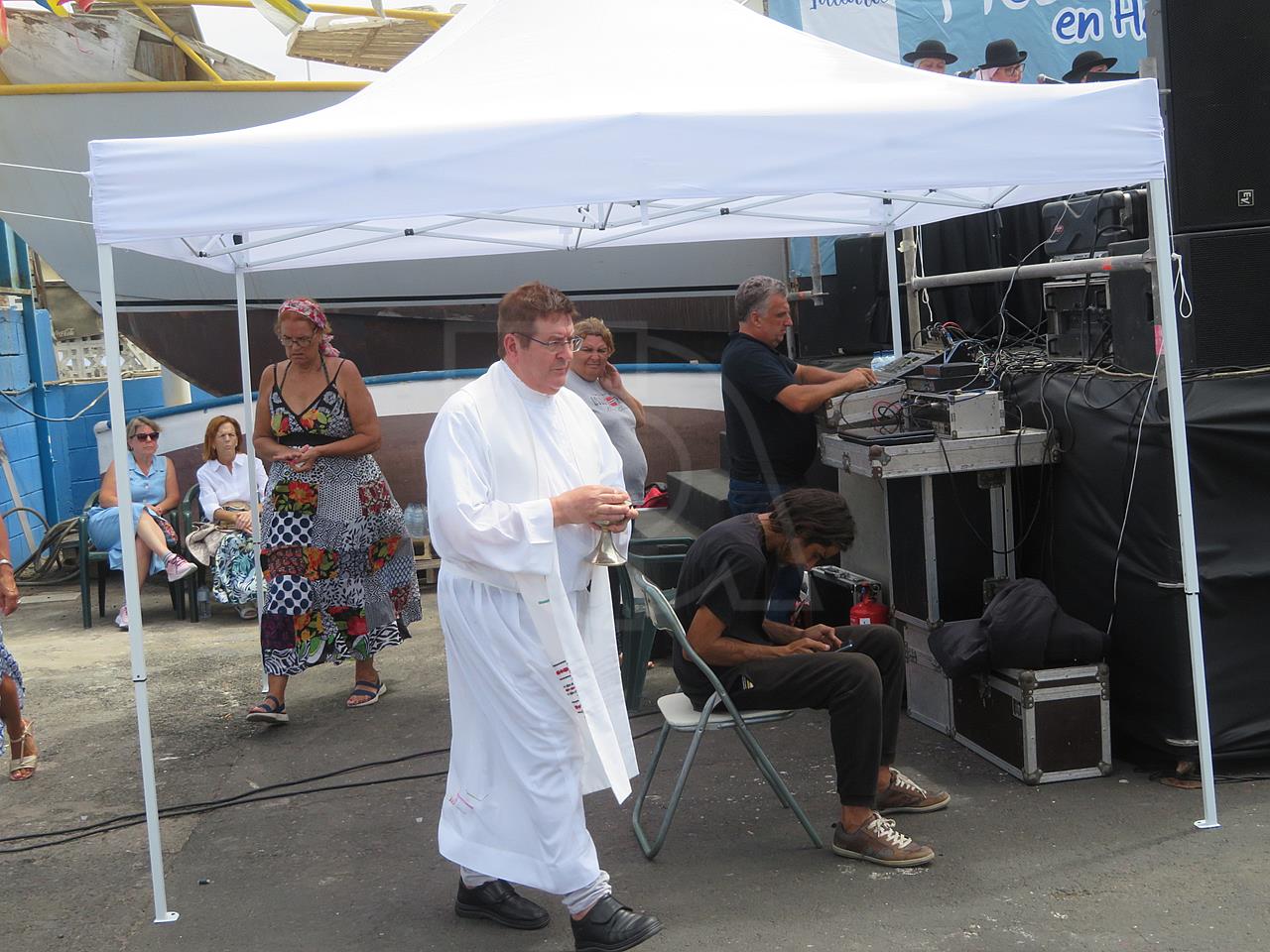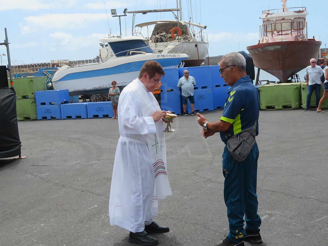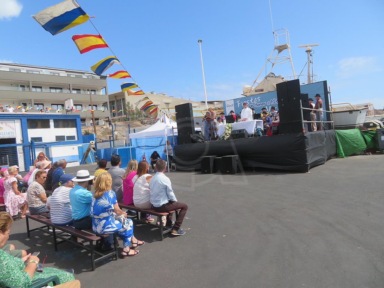 Decenas de personas asistieron a la misa previa, oficiada en la explanada del muelle pesquero y deportivo por el párroco Francisco Javier Martínez con el acompañamiento musical de la parranda Las Goteras.