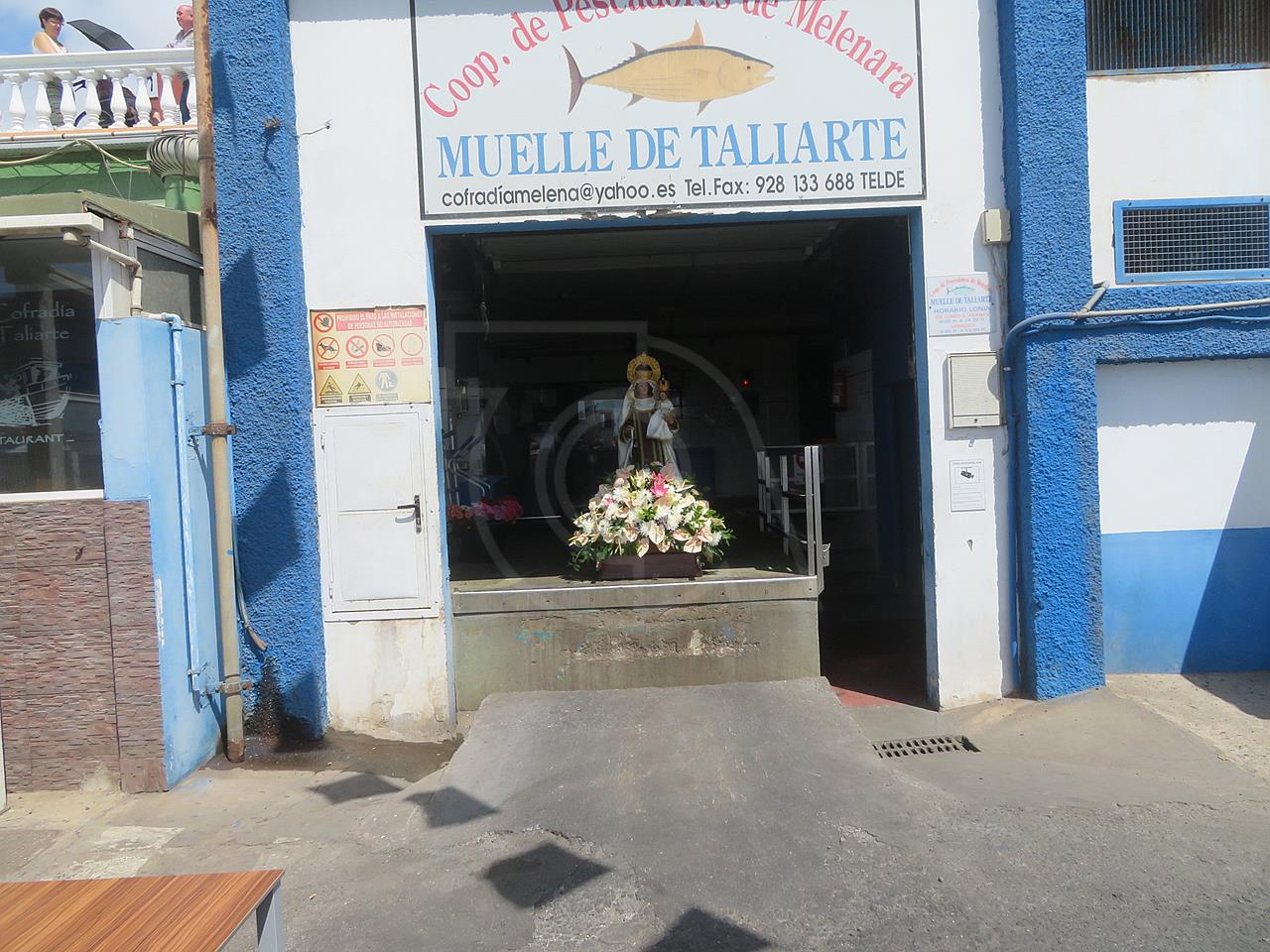 El desfile paró unos minutos delante de las antiguas cuevas bajo el faro de Taliarte para recibir una salva de voladores y ahí mismo la comitiva dio medio vuelta para tomar rumbo hacia la escollera, donde la imagen religiosa fue embarcada en El San Pedro, uno de los barcos de la flota de Taliarte y Melenara que faenan en estas aguas.