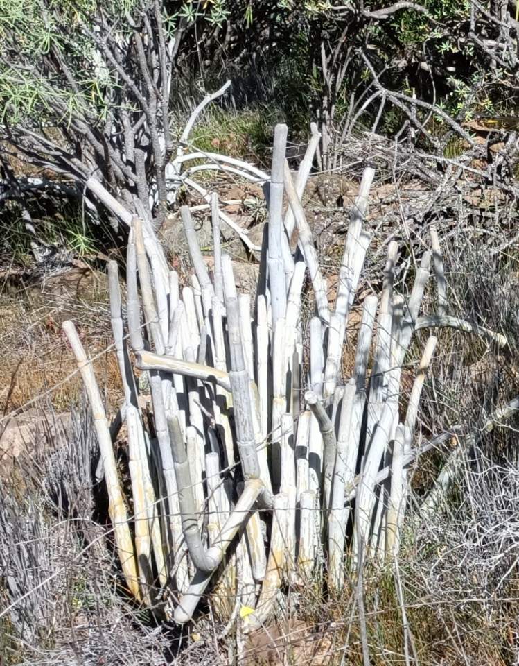 Sólo algunas, las menos, habían revitalizado su penacho de hojas con las últimas lluvias. Las observé aliviado, pero dudo que la esperanza de vida de estos ejemplares no sea más que un triste espejismo pues, su pérdida definitiva es simplemente una cuestión de tiempo.