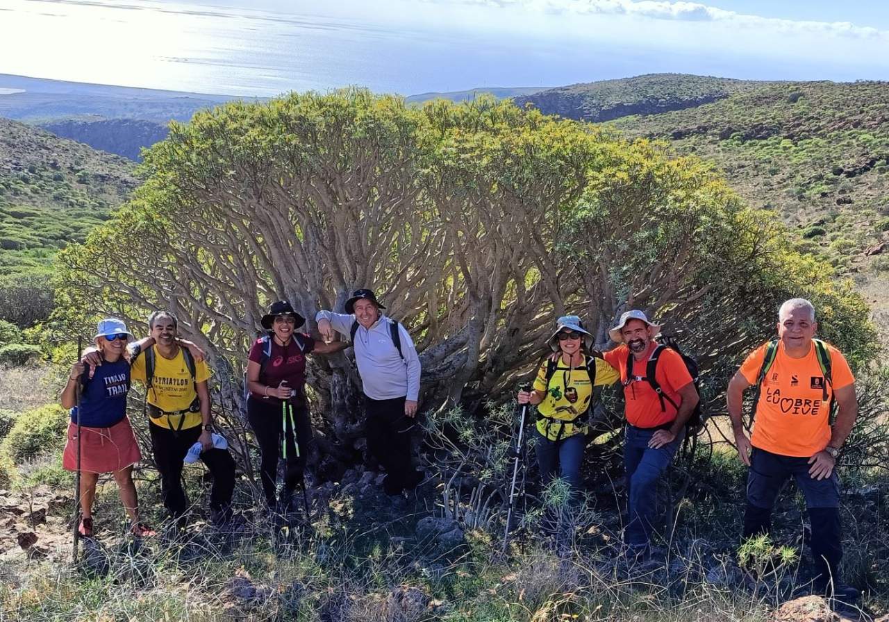 Degolladas y vaguadas, cresterías, lomos y mesetas. El objetivo, sin pretenderlo, era una inmersión en un paisaje de silencio, en un escenario natural de desmantelamiento geológico, de paisaje evolucionado donde el suelo aún es escaso, pues los suelos y rocas desprendidas están fragmentadas en forma de lajas y sólo aquellas especies de plantas con una extraordinaria adaptación pueden no sólo sobrevivir sino prosperar y alcanzar notables desarrollos. Es el sorprendente caso del “bosque” de tabaibas dulces que se encuentra entre las dos vertientes del barranco de las Culatillas y por donde, transitando bajo sus altos ejemplares y tupidos ramajes, perdemos la visibilidad de los miembros del grupo.
