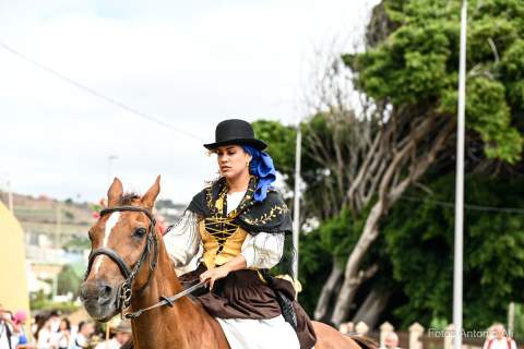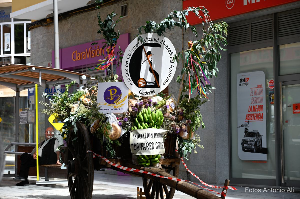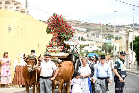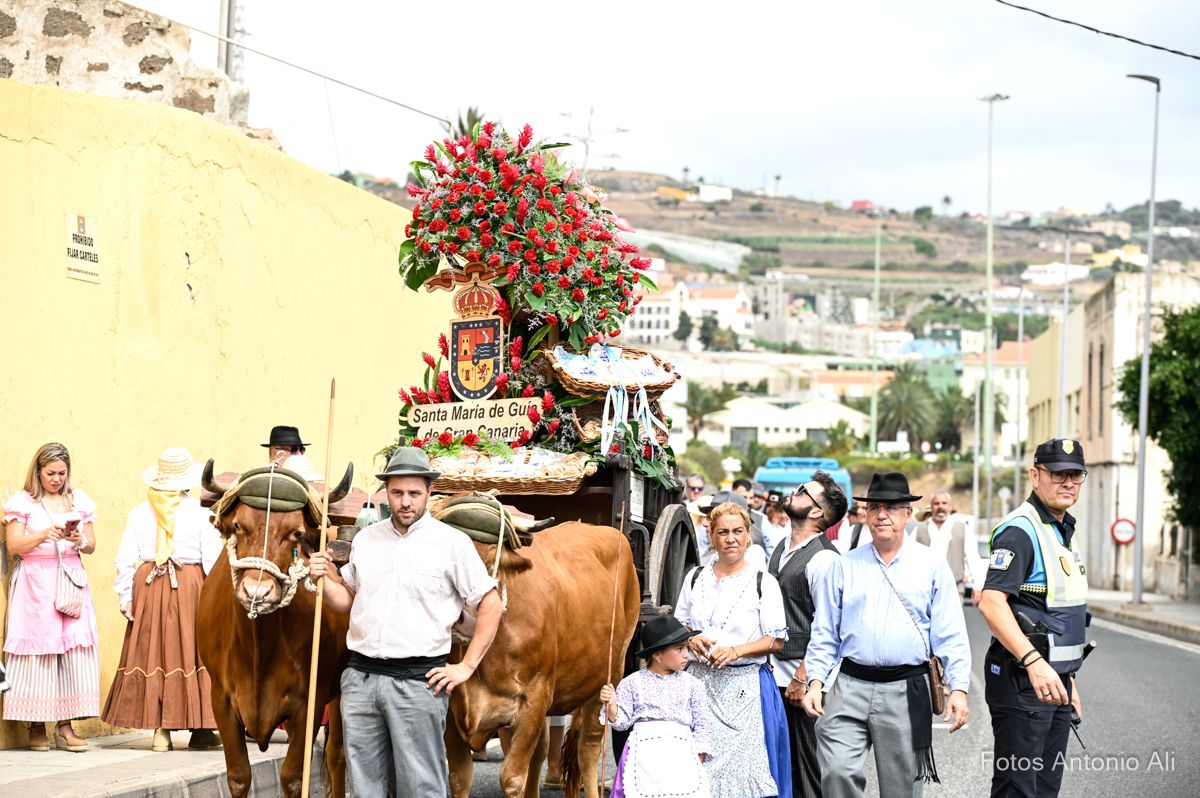 Tras el turno de las corporaciones comenzó el desfile de carretas, las parrandas y la animación del resto de romeros, que fueron disfrutando del recorrido y luciendo un correcto uso de la vestimenta tradicional en sus diferentes versiones y diseños de todas las islas. Los barrios de Gáldar y los colectivos se fueron sumando a la fiesta en un recorrido que fue una demostración de las costumbres canarias, con las carretas luciendo su decoración y sus ofrendas. Y tras las tiradas por yuntas, llegaron las protagonizadas por grupos de amigos y familias. La romería siguió en la Plaza de Santiago toda la noche con el Baile de Taifas y la posterior actuación de DJ Promaster.