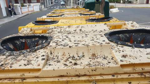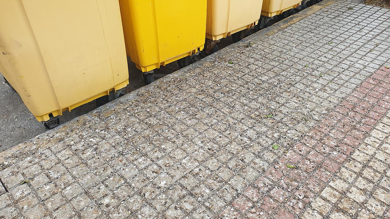 Sin embargo, los vecinos advierten que desde entonces los servicios de limpieza no han acudido al lugar con la frecuencia anterior. Una circunstancia que ha provocado que los excrementos de las aves tapicen el pavimento de la rambla y los depósitos amarillos y que la zona sea un verdadero foco de infección.