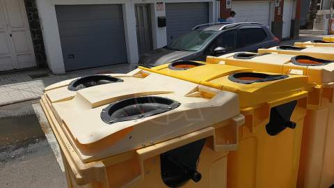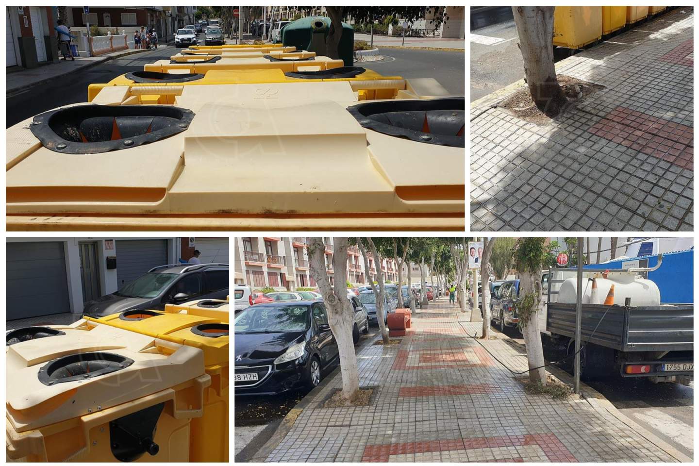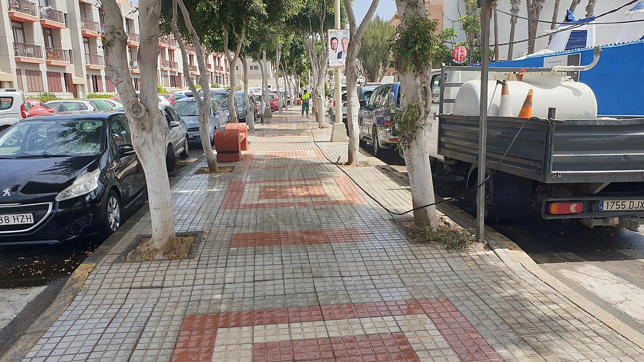 Unas horas después de la denuncia vecinal publicada por TELDEACTUALIDAD del estado de suciedad que presentaba la rambla central y los recipientes destinados a la recogida selectiva de recipientes de plásticos, tapizados de excrementos de aves, el servicio de Limpieza Municipal se presentó en el lugar para proceder a un aseo de choque de todo el espacio inundado de las inmundicias de palomas y tórtolas que anidan en los árboles.