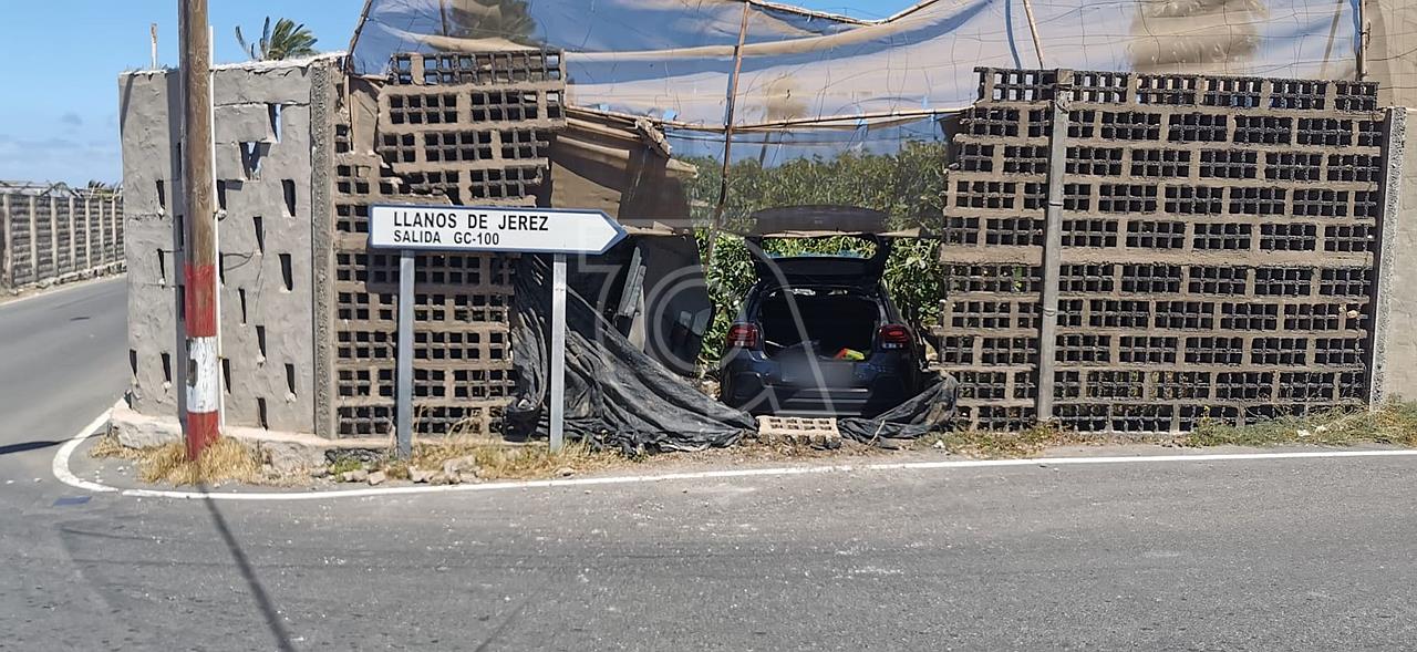 Un vehículo destrozó este lunes un antiguo muro de una finca en la zona de los Llanos de Jerez tras impactar contra él.