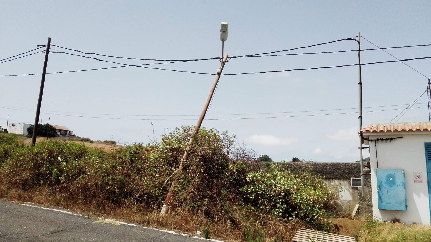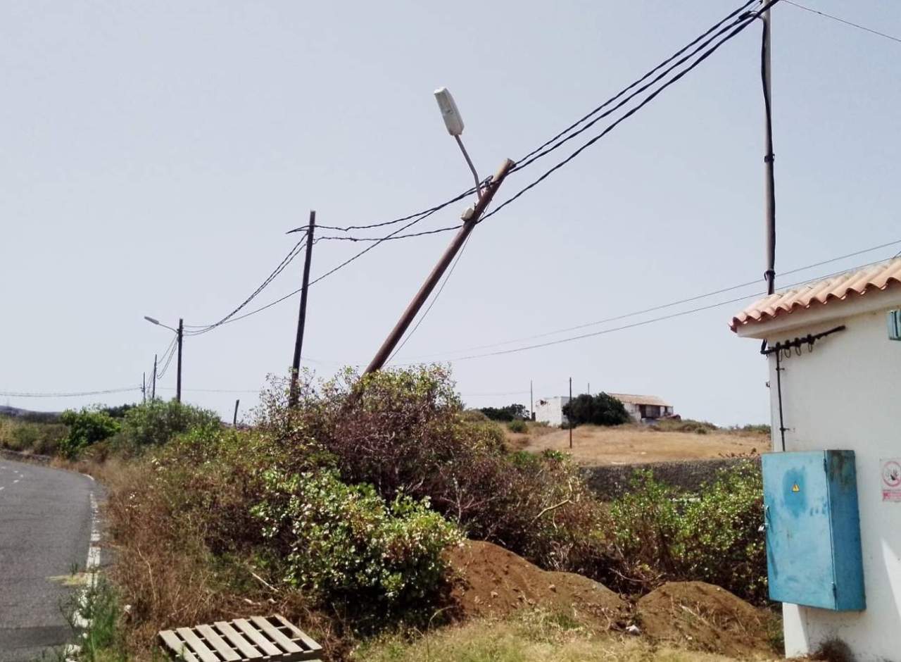 Vecinos de Telde alertan de un poste caído sobre el tendido eléctrico en la GC-803, subida hacia La Gavia, concretamente en el punto kilómetrico 1,8. Sostienen que han pasado la incidencia el pasado lunes al WhatsAppp que ha habilitado Elecnor para problemas con el alumbrado público, y hasta ahora no han tenido ninguna  respuesta.