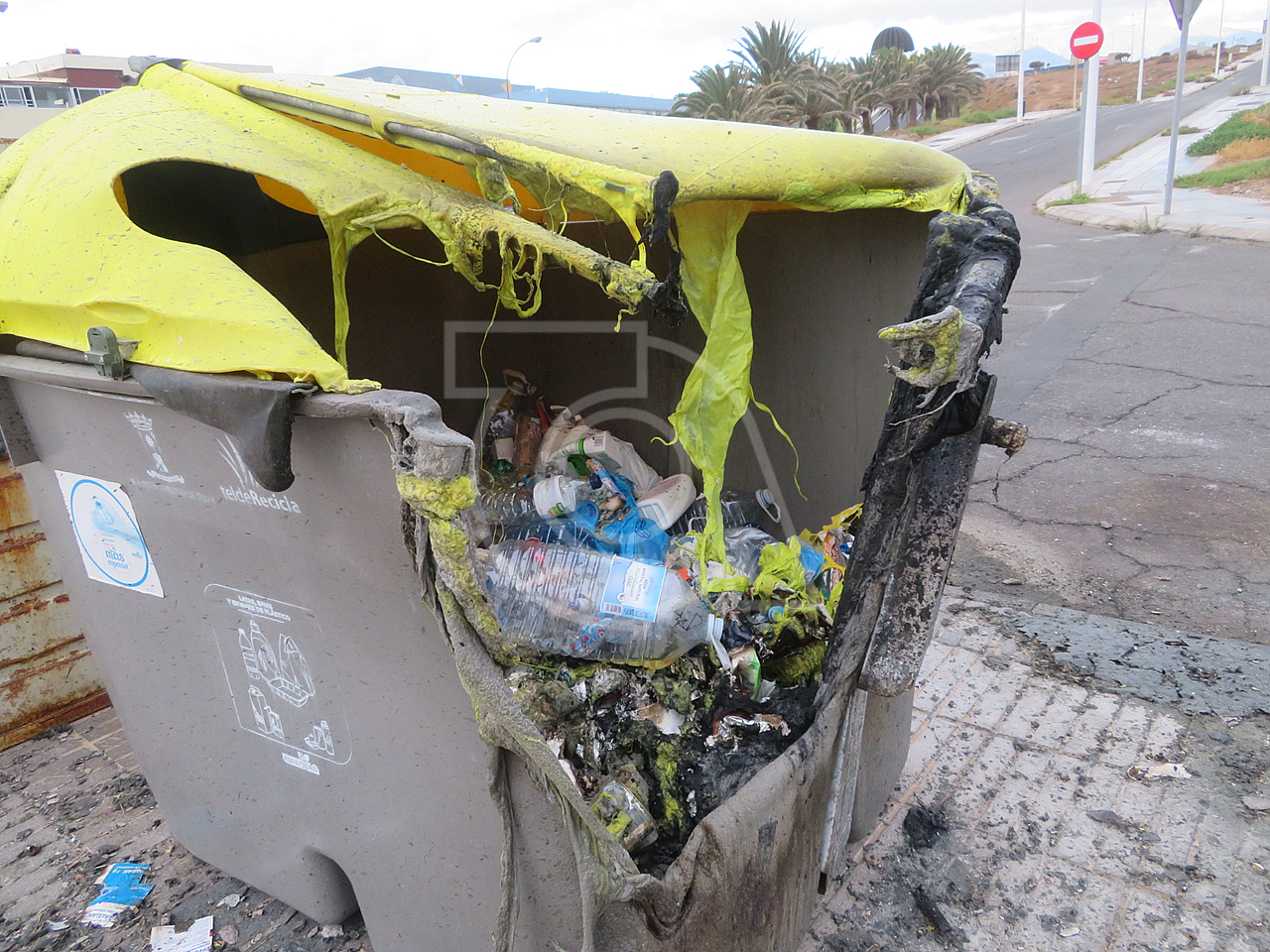 El incendio ocasionó daños a otro recipiente, también de plástico, con tapa amarilla, usado para el depósito de envases de plástico.