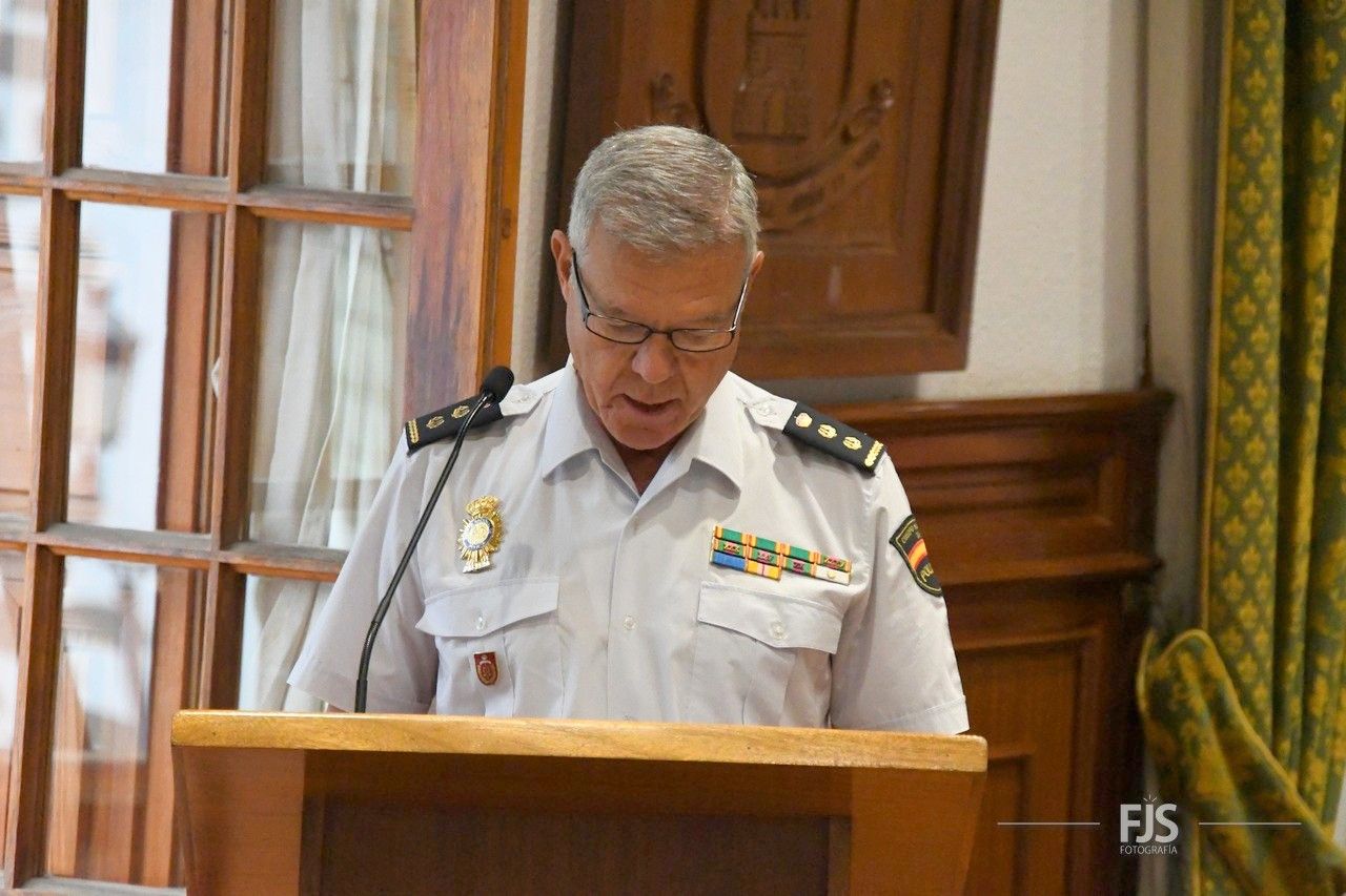 Seguidamente, presentó a León Valido, dos veces galardonado con la medalla al Mérito Policial con Distintivo Blanco. Destacó que el comisario jefe ingresó en la Policía Nacional en 1980 y tras pasar por diferentes comunidades autónomas, desempeñando un papel fundamental en la sociedad, en 2005 ascendió a Inspector Jefe de la Policía Nacional del Distrito Centro de Las Palmas de Gran Canaria y en diciembre de 2020 fue nombrado jefe de la Comisaría de Telde.
