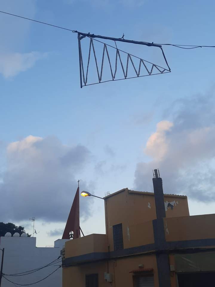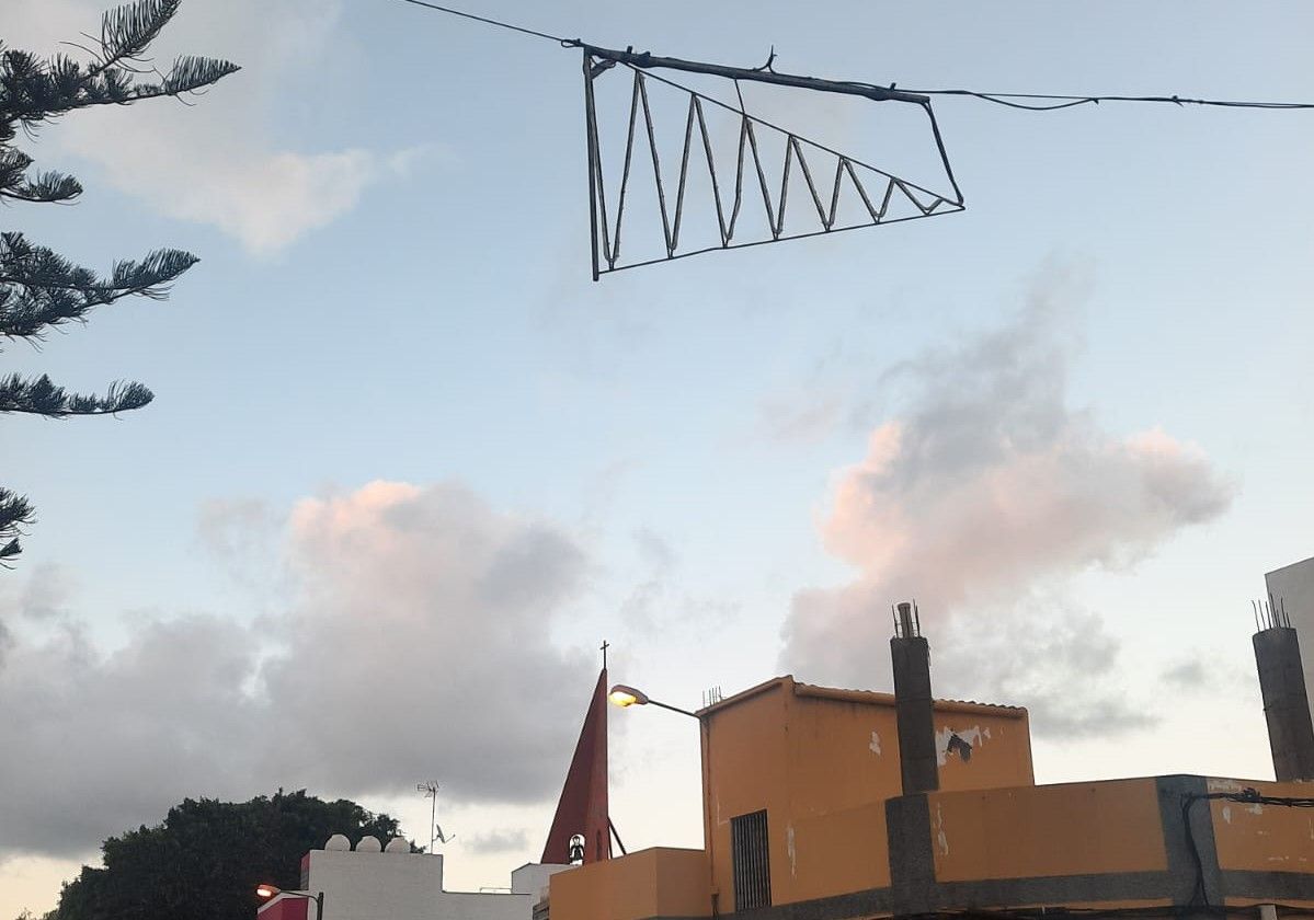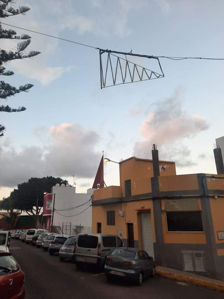 Vecinos de San José de Las Longueras denuncian que en el barrio aún hay colgados sobre sus calles motivos navideños de las pasadas fiestas que permanecen sin haber sito retirados.