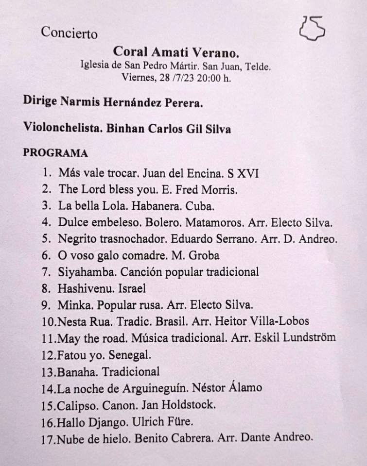 Bajo las bellas bóvedas artesonadas de la histórica y patrimonial iglesia hospitalaria de San Pedro Mártir de Verona, el Coro Amati del Círculo Cultural de Telde, la noche del viernes 28 de julio ofreció su concierto de verano dirigido por la profesora Narmis Hernández Perera, en un diverso y atractivo programa de composiciones, arreglos y adaptaciones músico vocales de brillante ejecución interpretativa de ritmos, tonos y registros de voces logrados por esta agrupación coral desde su fundación en 2011, ante un público asistente que llenó el emblemático recinto, que por su calidad y destacadas dotes interpretativas corales cada composición de las 17 que integraban el programa entregado para su seguimiento, fue largamente aplaudida y ovacionada.