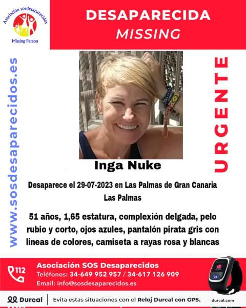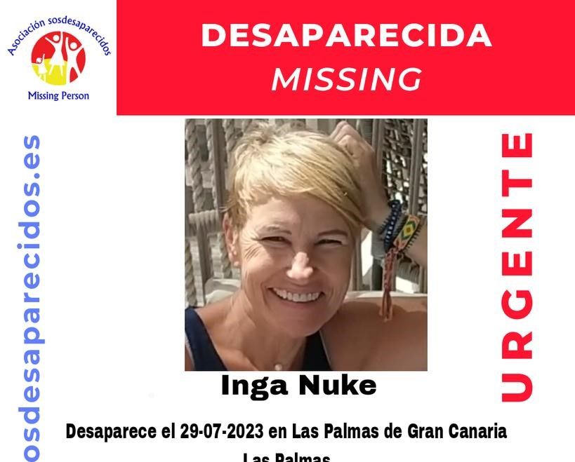 La Asociación SOS Desaparecidos ha activado la búsqueda de Inga Nuke,  de 51 años, vecina de la capital grancanaria. La organización, informa de que se trata de un caso de alta vulnerabilidad.