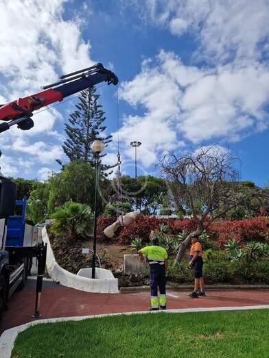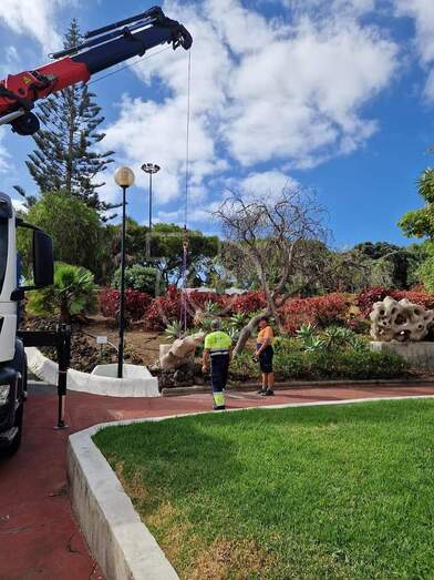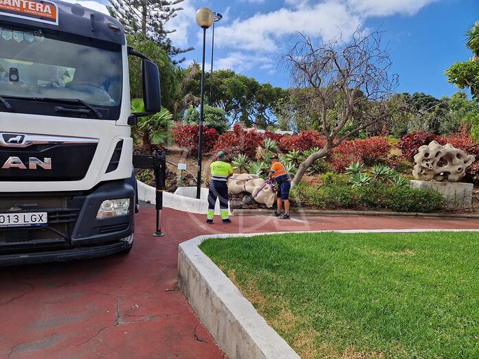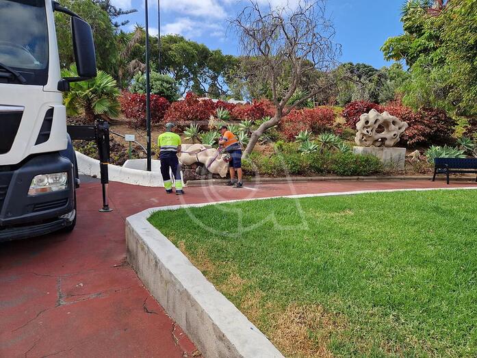El concejal de Parques y Jardines, Juan Francisco Artiles, que se enteró por TELDEACTUALIDAD de lo ocurrido a la escultura, se movilizó sobre la marcha y se preocupó de que personal de su departamentol recogiera los fragmentos de la valiosa obra para su traslado a un almacén municipal. Fue necesario el uso de una grúa debido a su tamaño y peso.