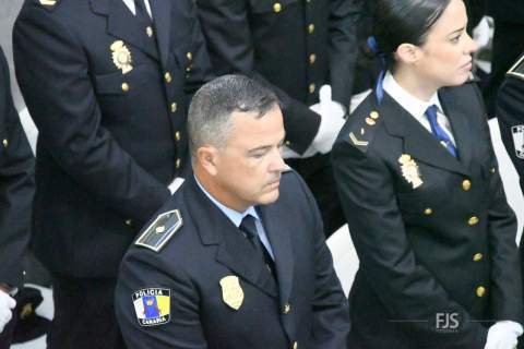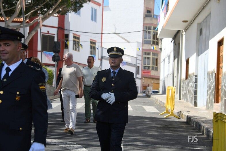 El título, de carácter honorífico y otorgado hace años por el Ayuntamiento de Telde, hizo posible que este sábado el trono con el que salió en procesión por las calles del pueblo fuera escoltado por un numeroso grupo de agentes de las Fuerzas y Cuerpos de Seguridad del Estado.