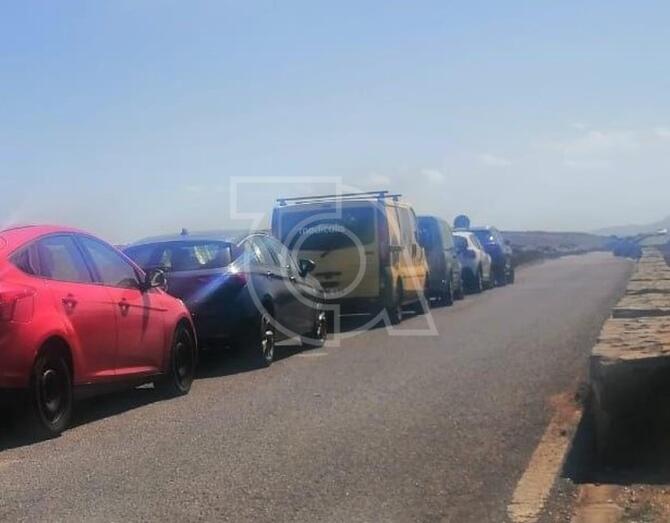 Así, se encuentra hoy domingo la carretera de entrada y salida a Tufia. Según denuncian vecinos, "el carril de entrada está ocupado por vehículos de residentes y visitantes de la zona, dificultando el paso de otros vehículos".