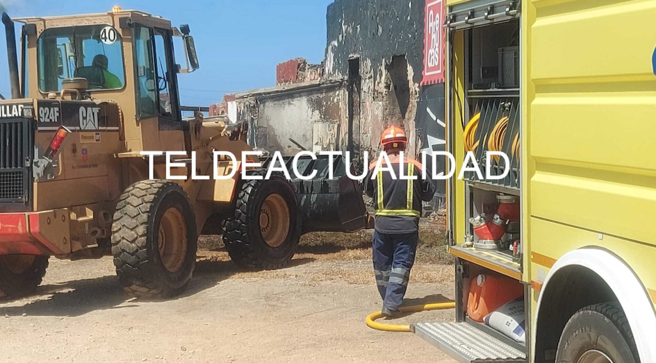 Bomberos del Consorcio de Emergencia y efectivos de la Agrupación de Protección Civil de Telde actúan en la zona con la ayuda de una excavadora del Ayuntamiento de Telde que remueve los escombros y la basura para tratar de extinguir por completo el incendio.