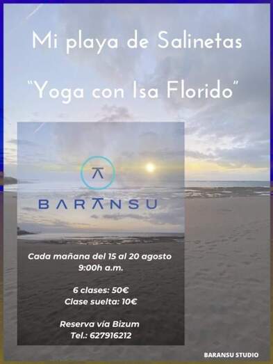 La playa de Salinetas acoge del 15 al 20 de agosto seis sesiones de yoga a cargo de Isabel Florido Mayor de Baransu Studio. El objetivo de la actividad, que tendrá lugar a las 9.00 horas, es desarrollar aspectos básicos y fundamentales para entender esta práctica.