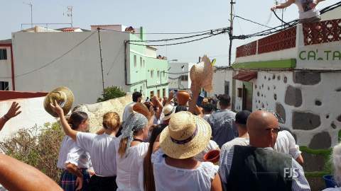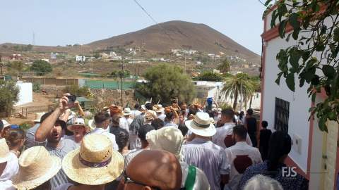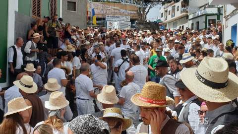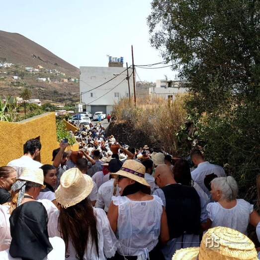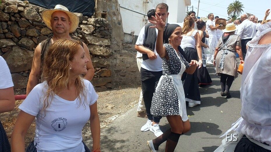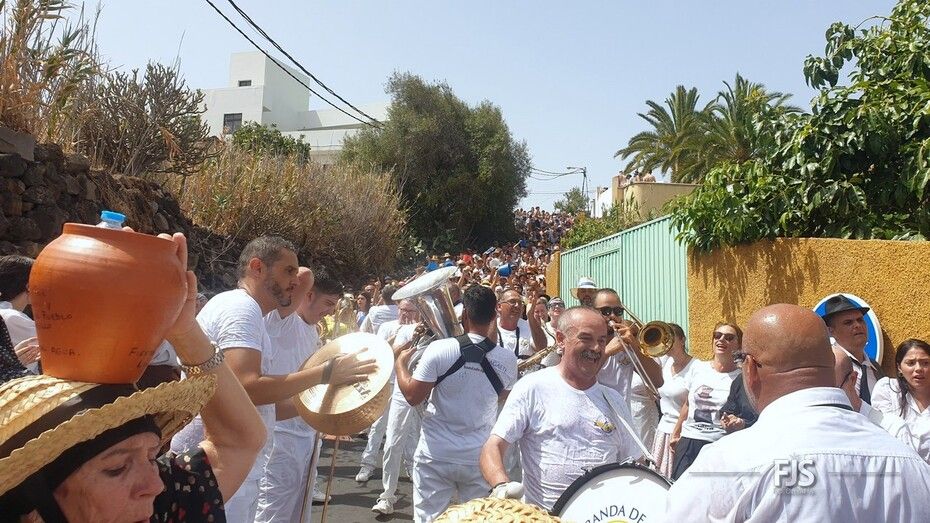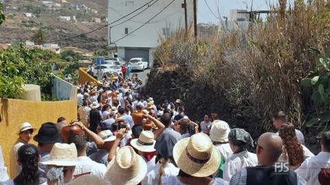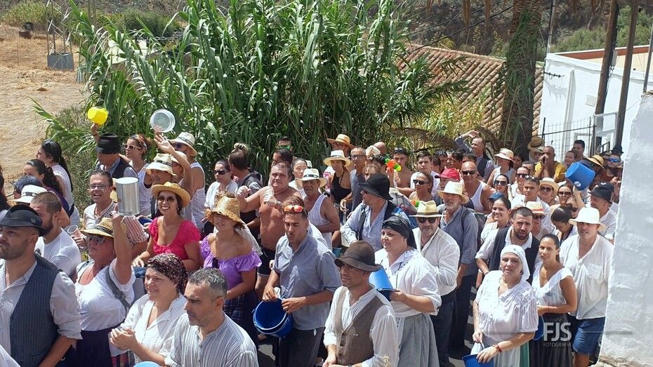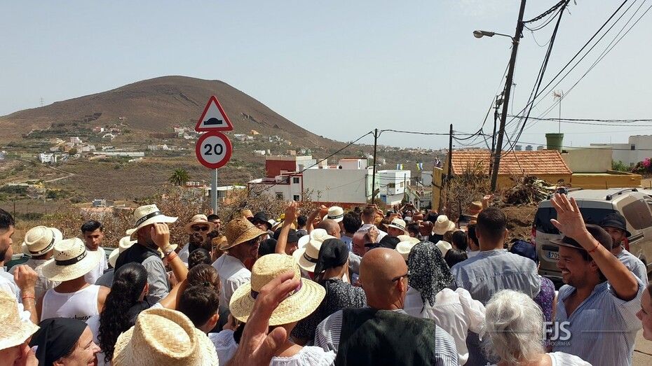 Alrededor del millar de personas comenzaron la bajada por esta vía al grito “Agüita, agüita, la gente está sequita” en dirección hacia la carretera general junto a la acequia de la Heredad del Valle de los Nueve, punto de encuentro para la tradicional batalla del agua del evento más popular y participativo de las fiestas de Lomo Magullo en honor de la Virgen de las Nieves que organiza el Patronato El Naciente que preside Salvador Santana Flores.