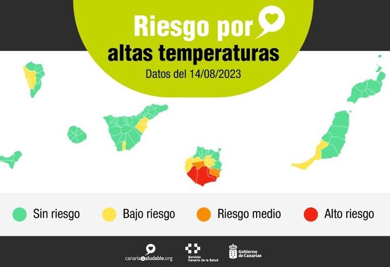 Con las previsiones de la AEMET a día 14 de agosto continúan los avisos de riesgo para la salud por altas temperaturas, que en tres municipios de Gran Canaria se prorrogan unos días más, hasta el 20 de agosto, mientras que Telde queda fuera de todos los avisos.
