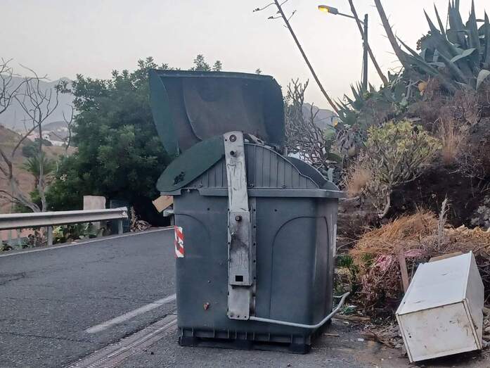 Vecinos del barrio teldense de La Solana llama la atención al servicio de Recogida de Residuos Sólidos y Limpieza Viaria de la existencia de un contenedor roto junto a la vía de acceso al lugar.