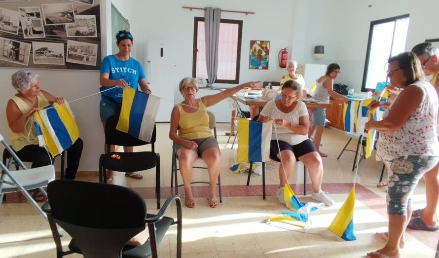Vecinos de Melenara preparan la decoración del barrio para sus fiestas, en honor del Santo Cura de Ars y de la Virgen del Carmen, que arrancan este viernes con el pregón de Jorge Santana. Y para ello orearon este jueves las banderas que se colocarán en las calles de este enclave costero.