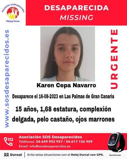 La Asociación SOS Desaparecidos ha activado la búsqueda de la adolescente Karen Cepa Navarro, de 15 años, que fue vista por última vez este pasado miércoles, 16 de agosto, en la capital grancanaria.
