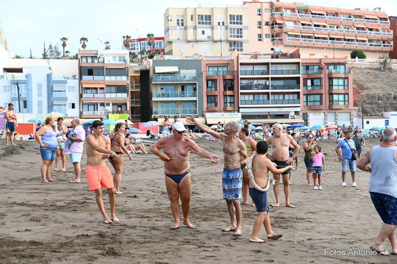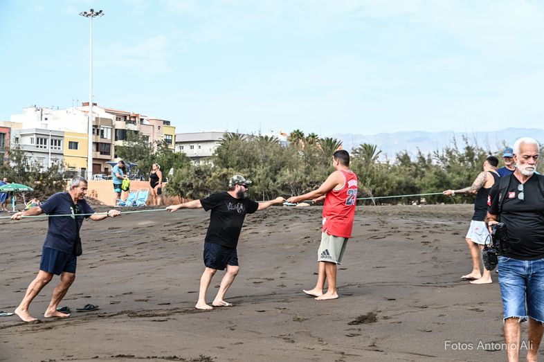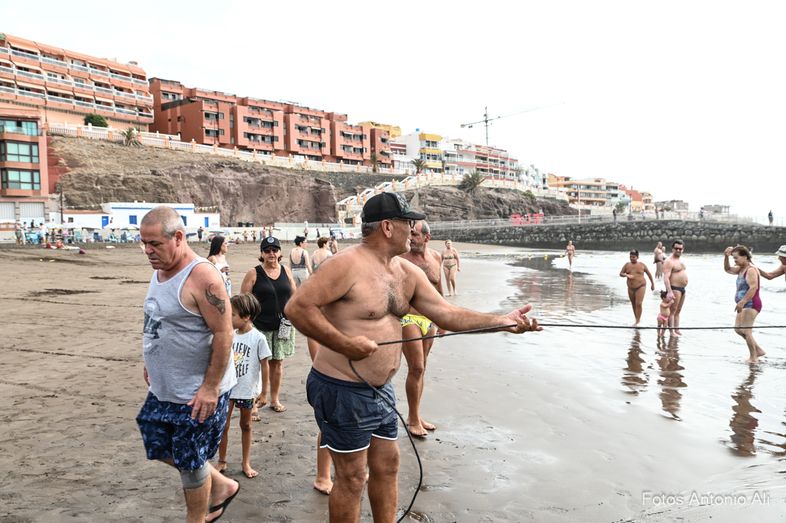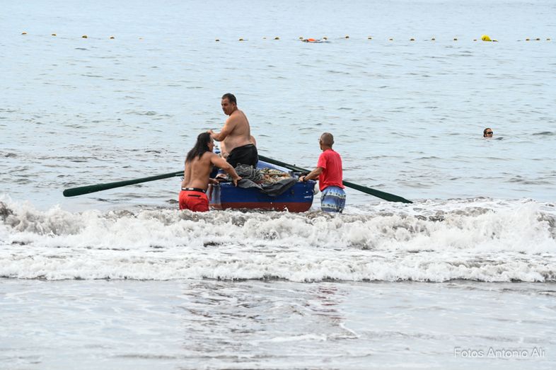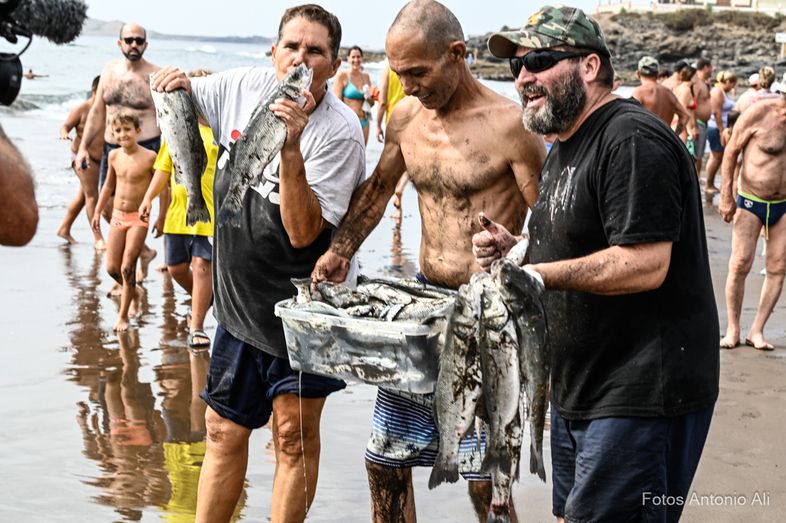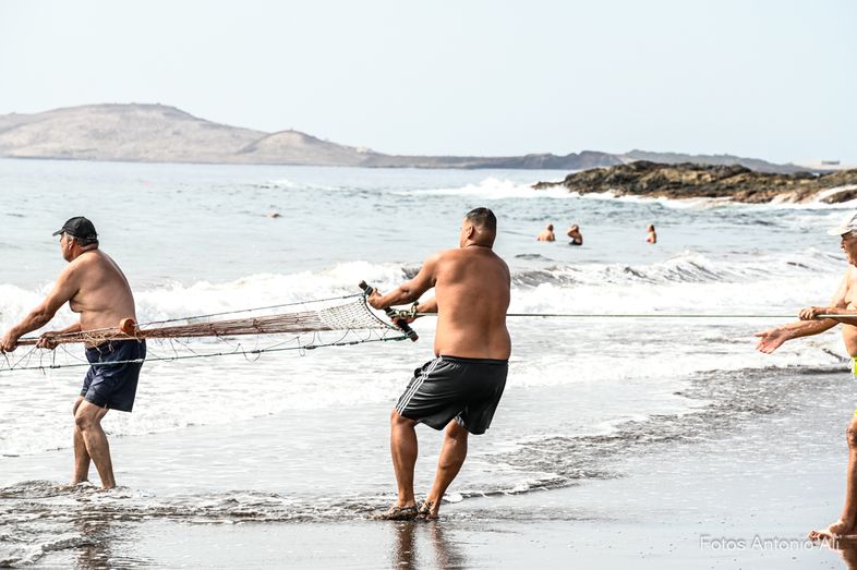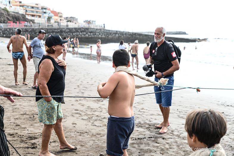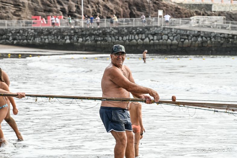 La calufa marcó este domingo la recreación del arte tradicional de pesca del chinchorro en la playa de Melenara, un acto propio de las fiestas patronales de este barrio de pescadores en honor del Santo Cura de Ars y de la Virgen del Carmen.