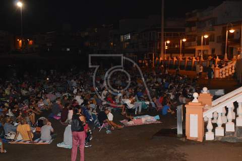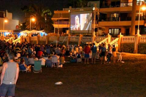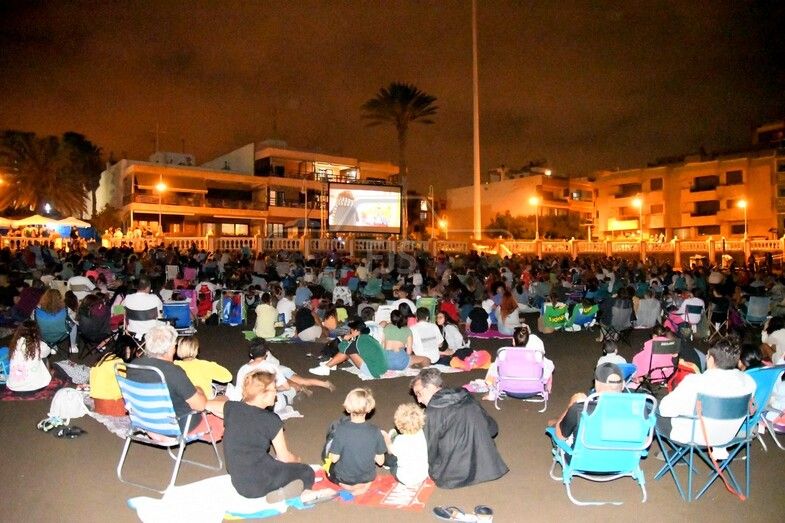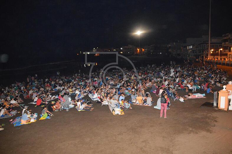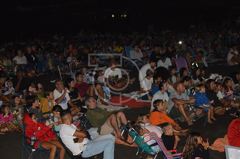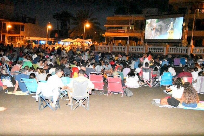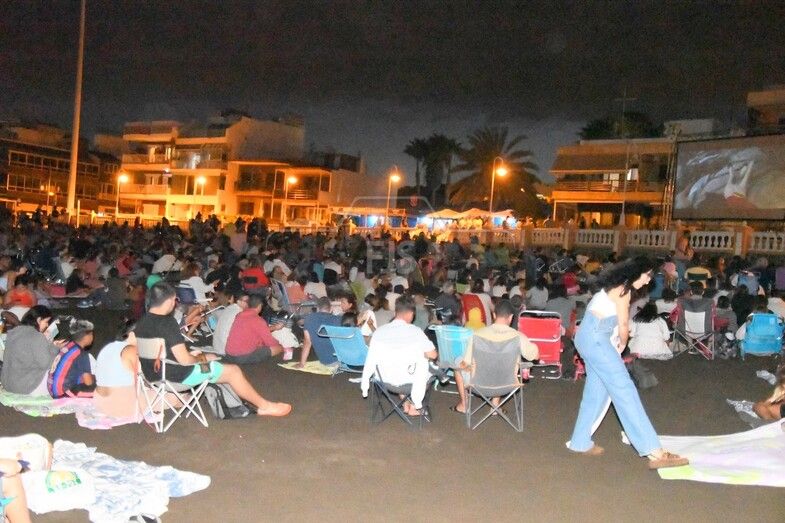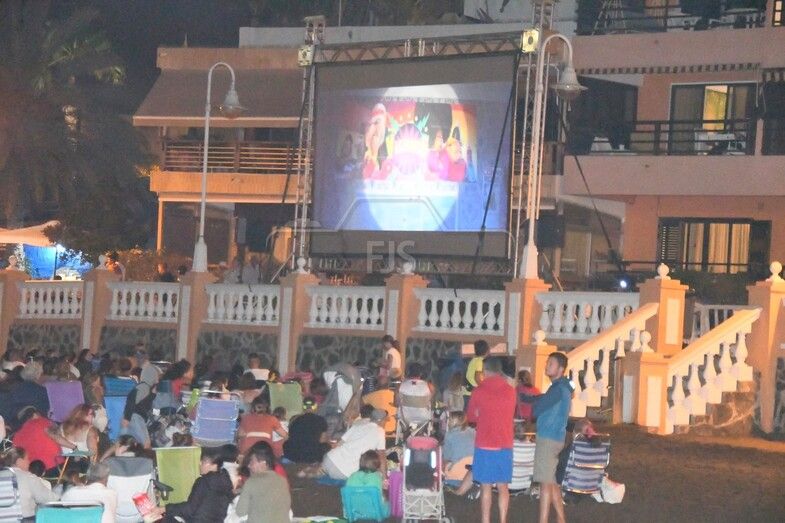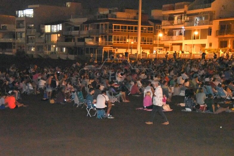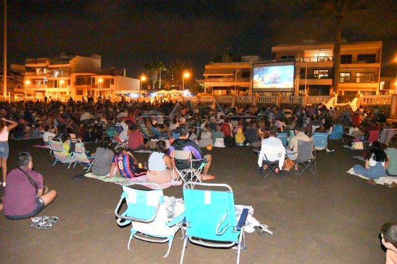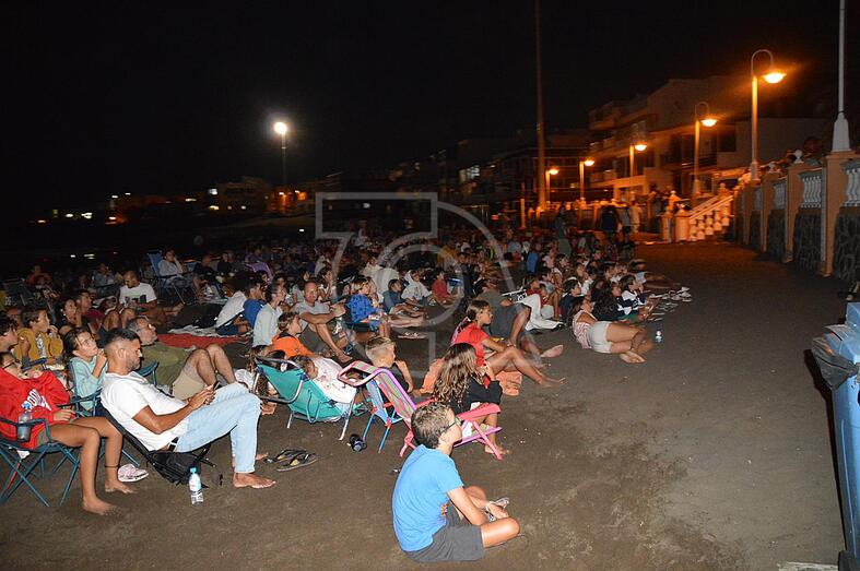 El alcalde Juan Antonio Peña y los ediles Juan Martel (Cultura) y Cristhian Santana (Juventud) disfrutaron con los asistentes del espectáculo cinematográfico  seguido por el público desde la arena  en una gran pantalla instalada en la avenida de esta cala teldense.