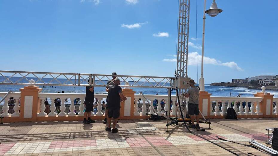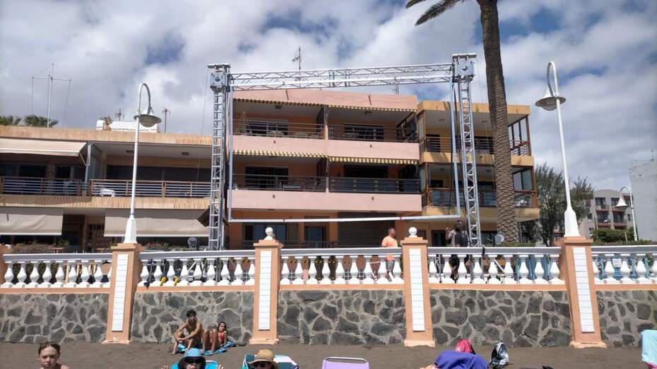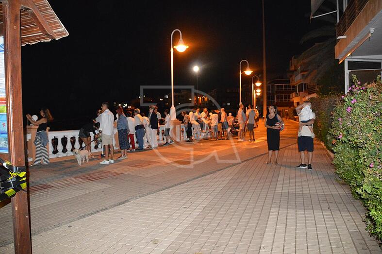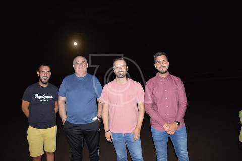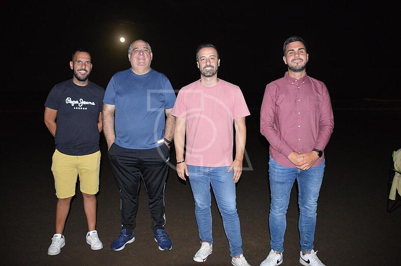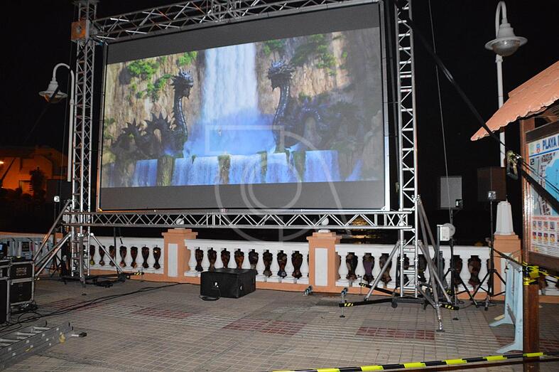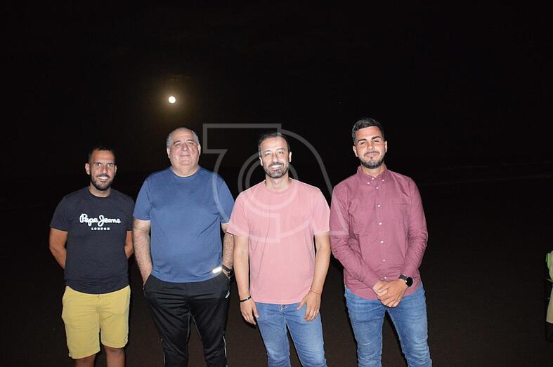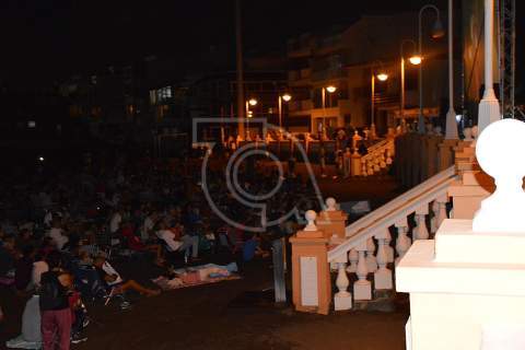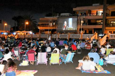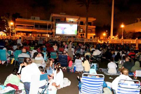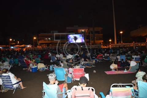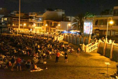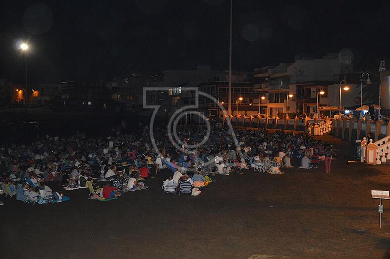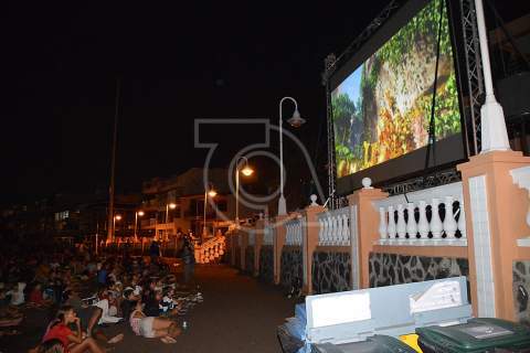 El alcalde Juan Antonio Peña y los ediles Juan Martel (Cultura) y Cristhian Santana (Juventud) disfrutaron con los asistentes del espectáculo cinematográfico  seguido por el público desde la arena  en una gran pantalla instalada en la avenida de esta cala teldense.