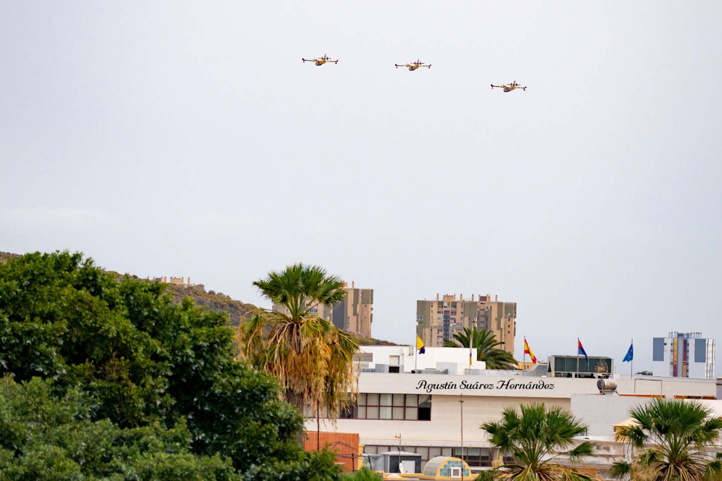 z Hernández logró la instantánea del paso de tres anfibios del Grupo 43 de las FFAA (antiguo 404 Escuadrón). Vistos al fondo de las dos torres de la Basílica de san Juan. Que cumple 50 años como basílica menor. Nos trae el recuerdo del toque de rebato de las campanas el 14 de diciembre de 1973, en esa madrugada ardían las naves del Sindicato Agrícola del Sur de la calle Doramas.