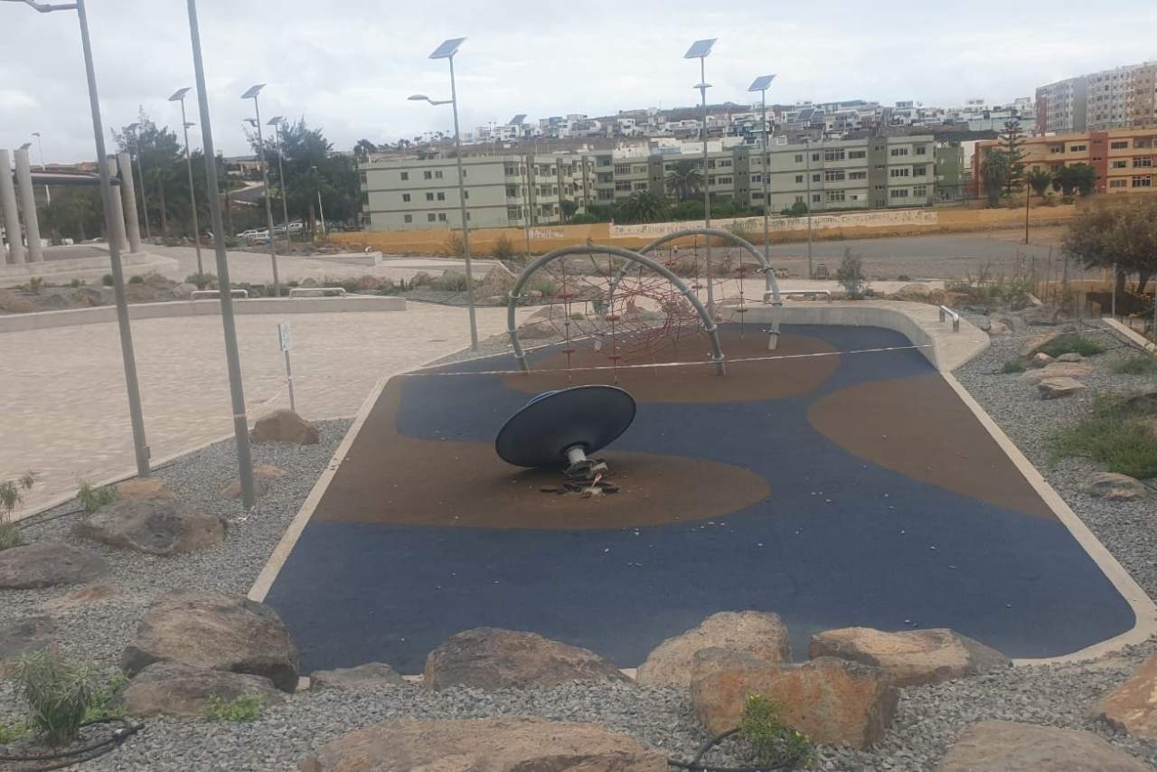 El juego infantil que se rompió por segunda vez consecutiva el pasado sábado 26 de agosto en el parque infantil del nuevo parque urbano de Melenara aún permanece tirado en este espacio a la espera de su arreglo, tal y como denunció este periódico días atrás.