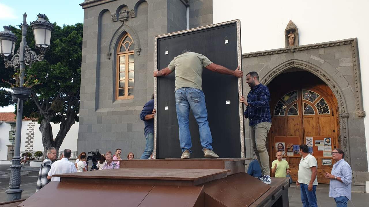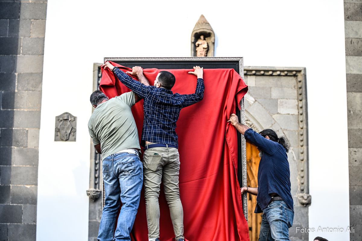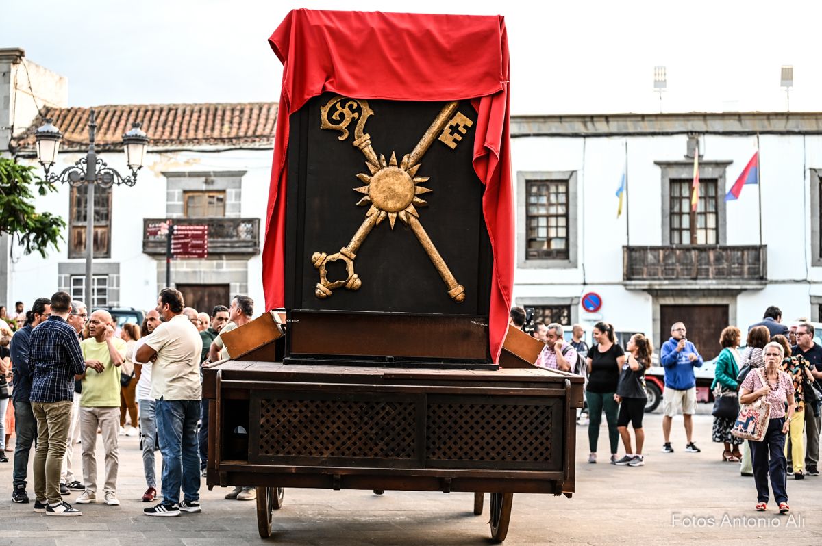 La representación teldense fue acogida esta noche entre la multitud asistente “con entusiasmo y alegría”, en el templo de San Juan. El público rompió en aplausos cuando el alcalde y el concejal de Festejos descubrieron la imagen de la venerada escultura, una instantánea captada en el altar mayor con un dron de la Policía Local de Telde.