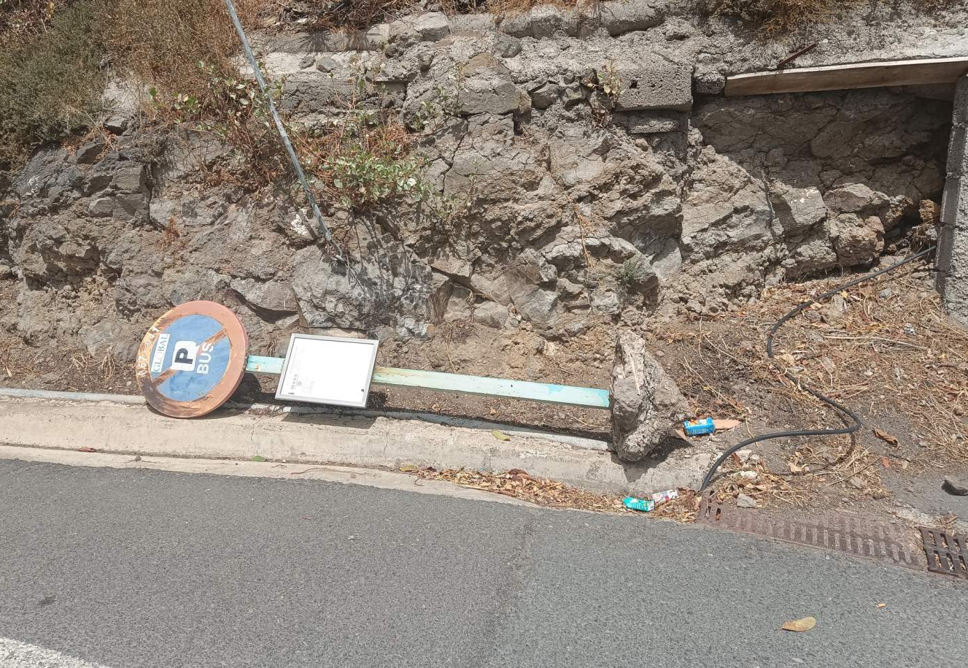 Ni el Cabildo, cuyos operarios pasan a diario por la zona, lo ha visto; ni responsables del Ayuntamiento, cuyo concejal de Tráfico que, junto con el alcalde y otros concejales/as y con motivo de las fiestas de San Roque, han pasado en las últimas fechas varias veces por el lugar, lo han visto. Nadie. Es más, ni siquiera la propia compañía que presta el servicio a diario, ha visto una señal que lleva mucho tiempo tumbada en el suelo y en la que nadie repara. "Sí, sí, tan grande y resulta invisible a los ojos de los responsables", comentan los vecinos.