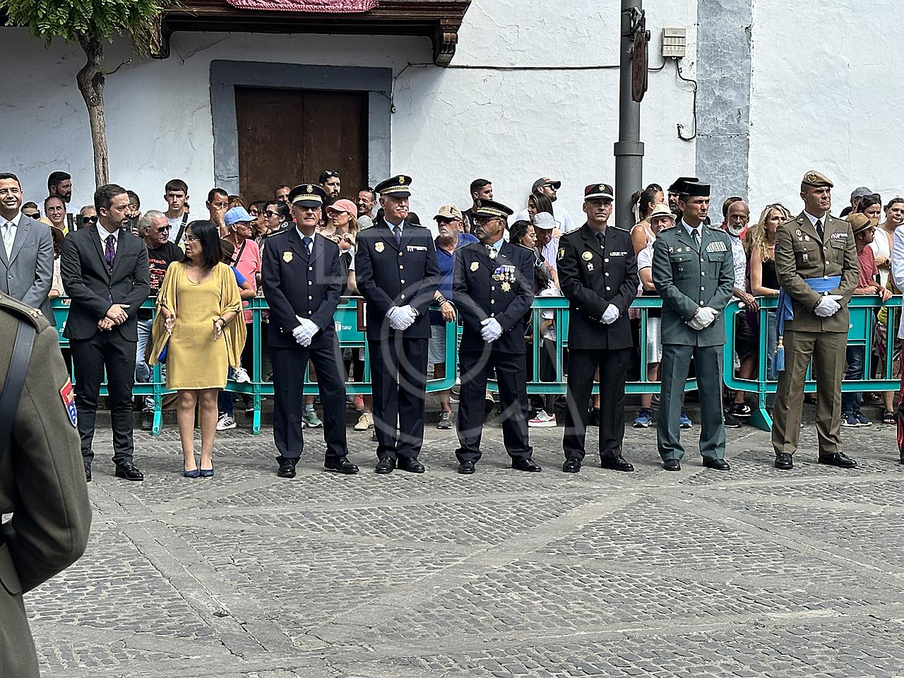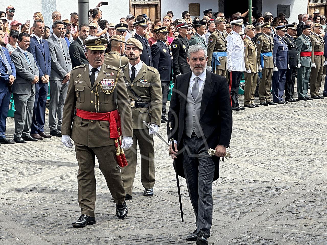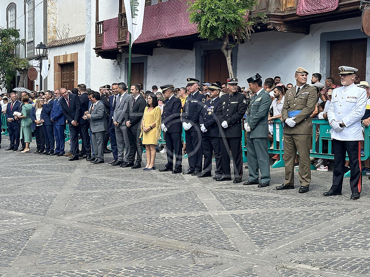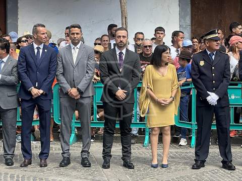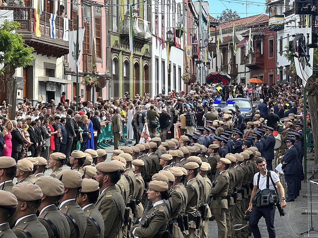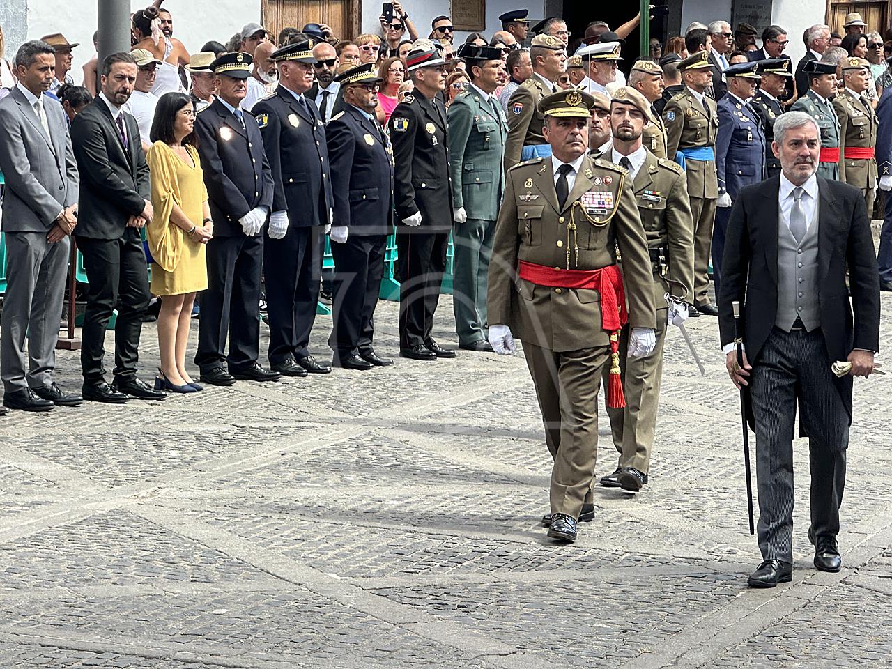 La solemne misa oficiada por el obispo de la Diócesis, Monseñor José Mazuelos, estuvo precedida del acto oficial de recepción del representante de S.M. el rey, el presidente del Gobierno de Canarias, Fernando Clavijo, a las 11.15 horas, al que siguió el desfile militar y, posteriormente, la eucaristía a las 12.00 horas, y la procesión, que mantuvo el recorrido del pasado año pasando por las calles de Iglesia Chica, la Cal, Nueva, Isaac Domínguez y Real de la Plaza.