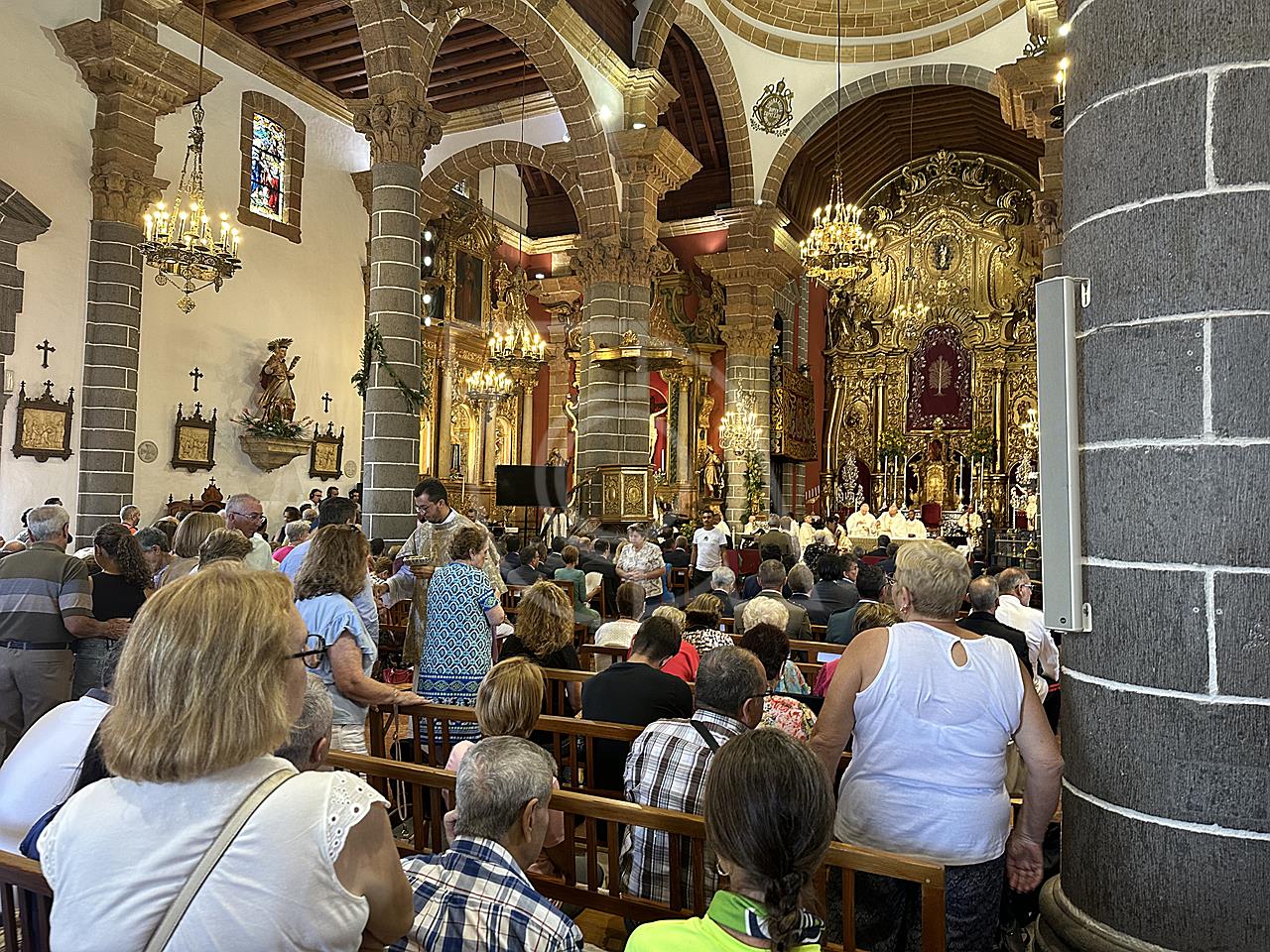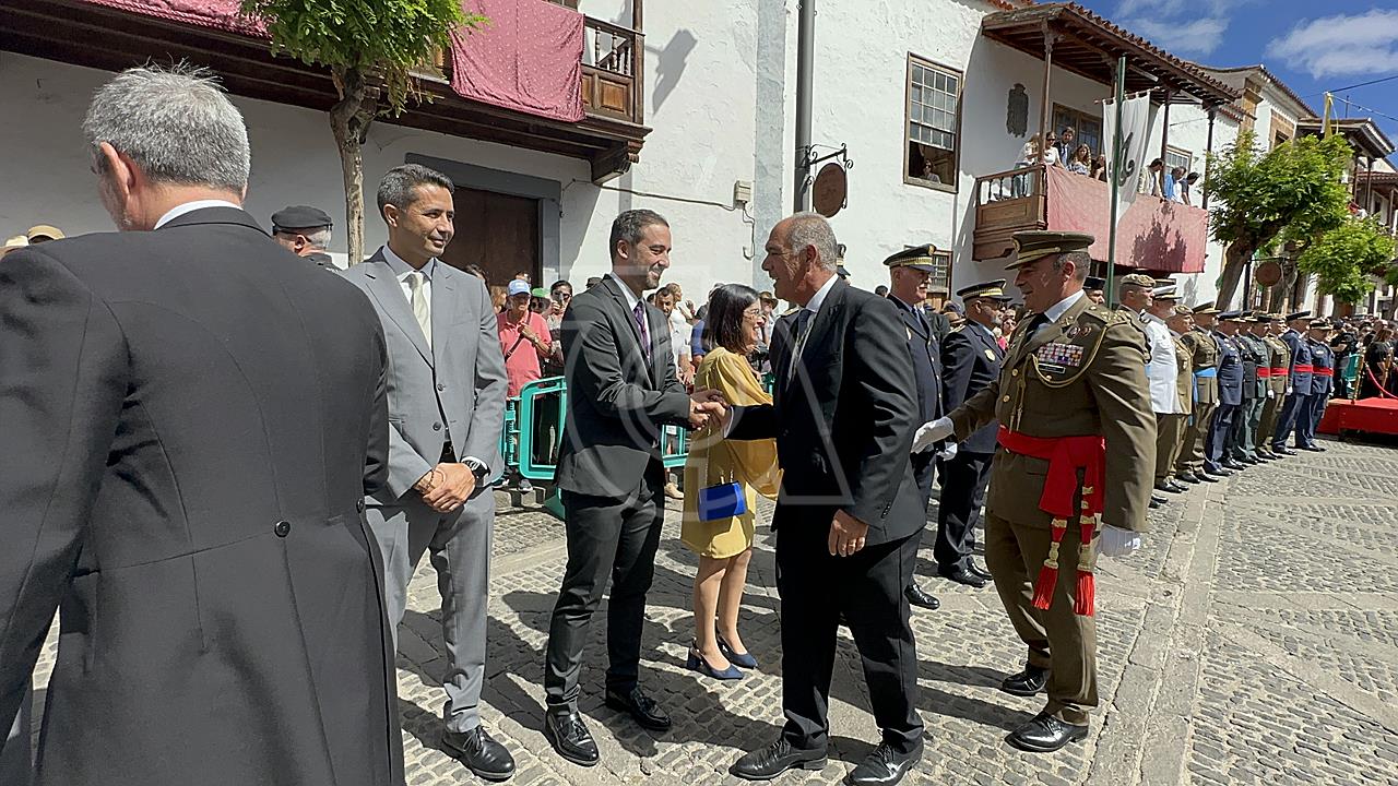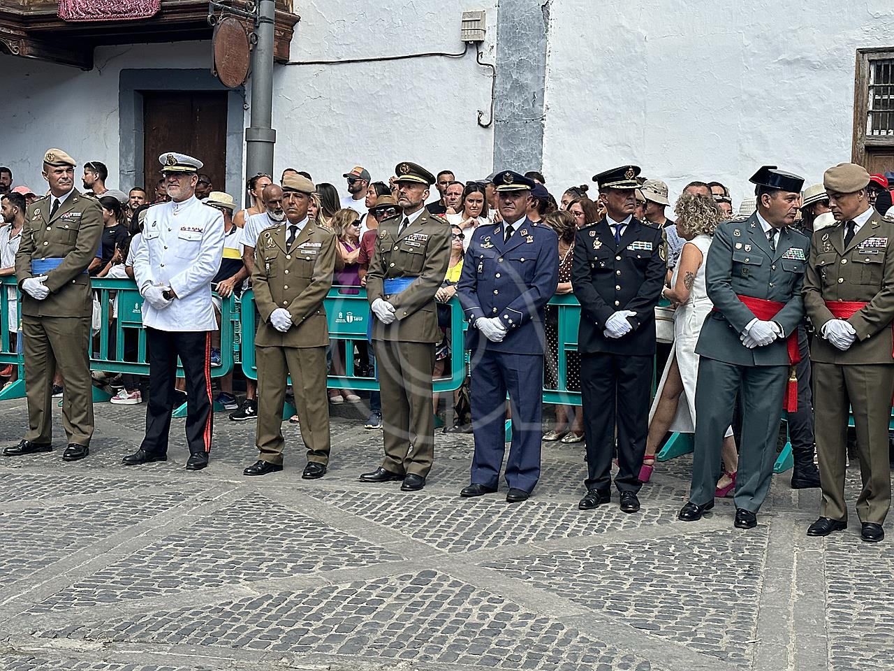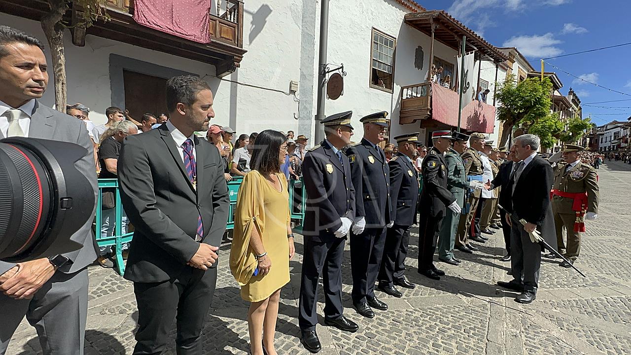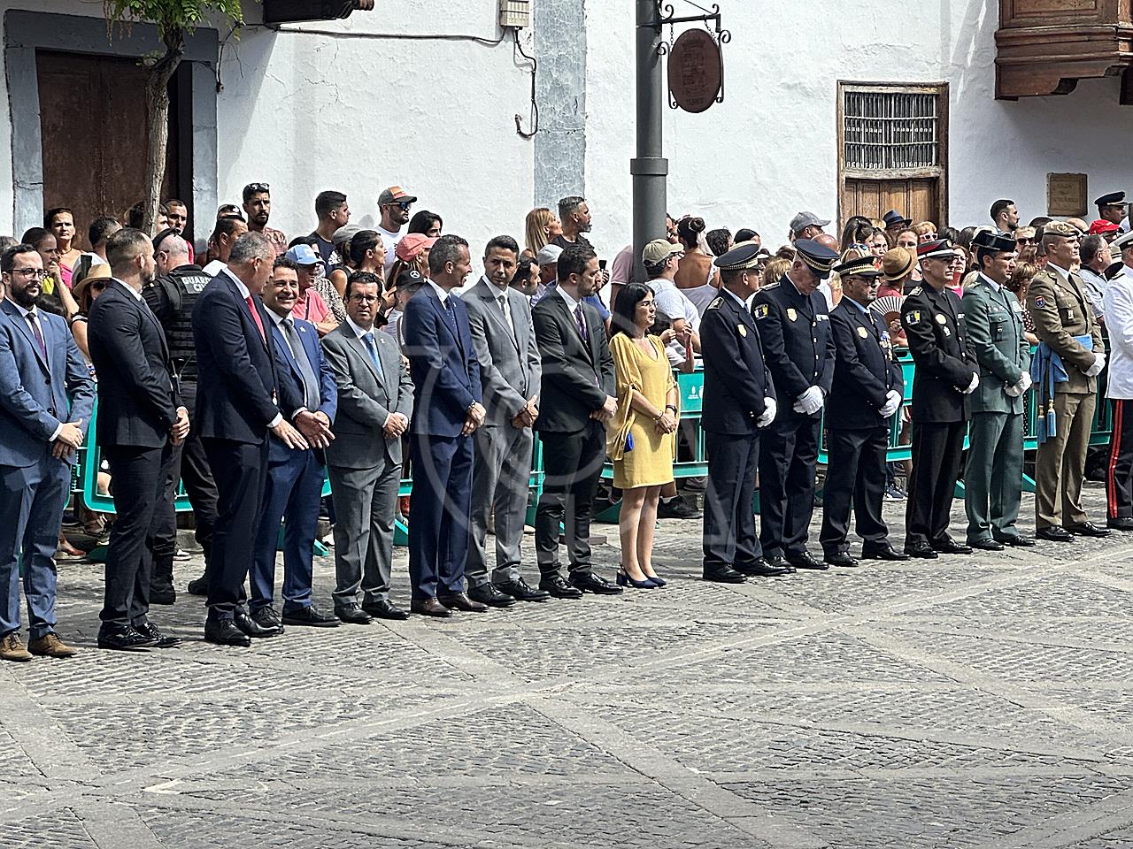 La solemne misa oficiada por el obispo de la Diócesis, Monseñor José Mazuelos, estuvo precedida del acto oficial de recepción del representante de S.M. el rey, el presidente del Gobierno de Canarias, Fernando Clavijo, a las 11.15 horas, al que siguió el desfile militar y, posteriormente, la eucaristía a las 12.00 horas, y la procesión, que mantuvo el recorrido del pasado año pasando por las calles de Iglesia Chica, la Cal, Nueva, Isaac Domínguez y Real de la Plaza.
