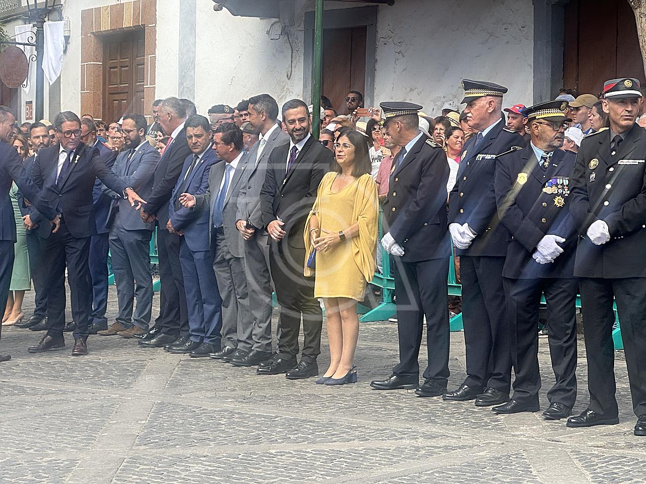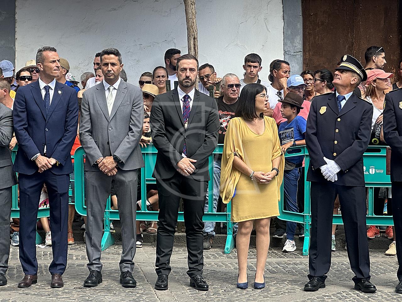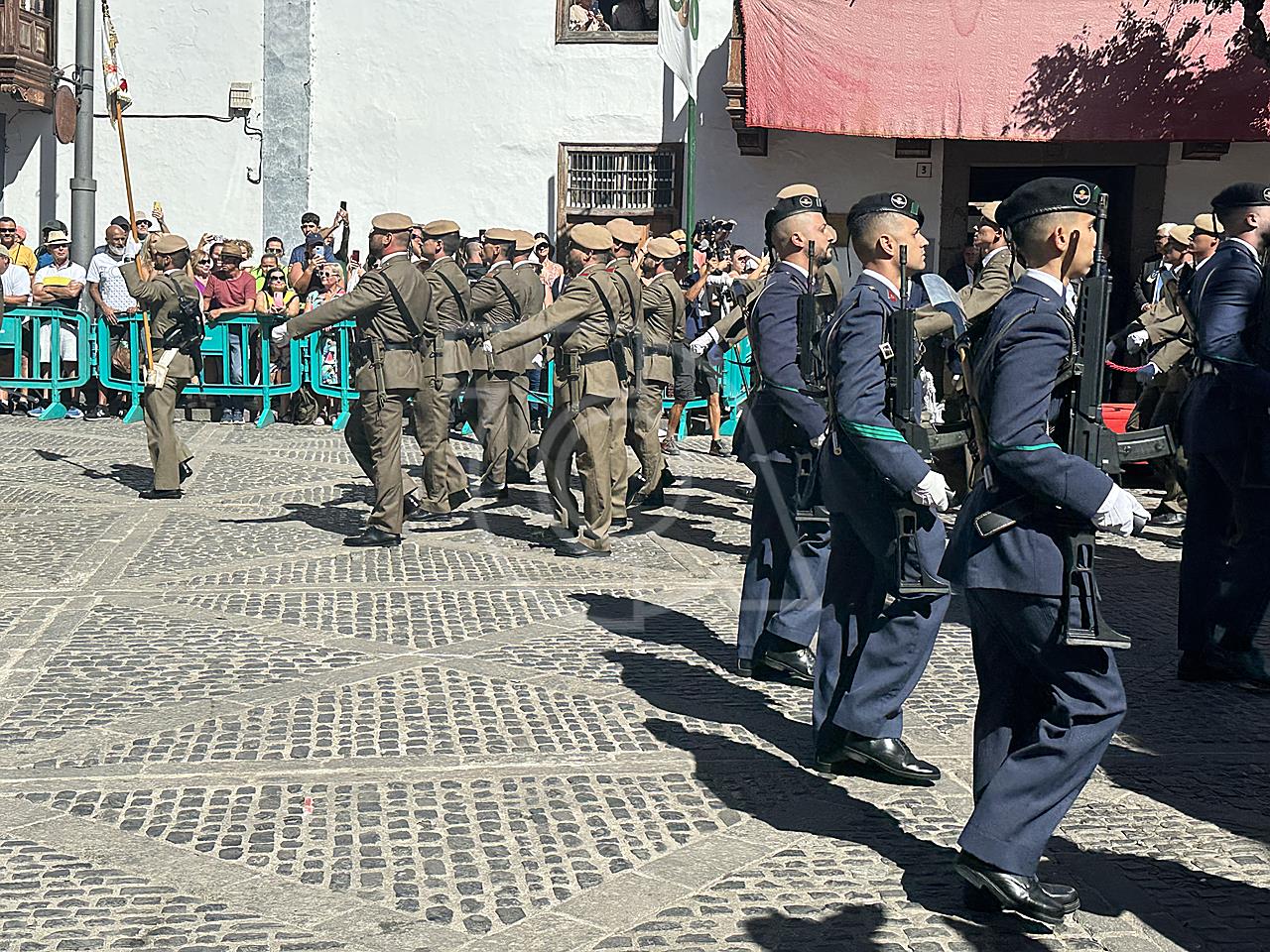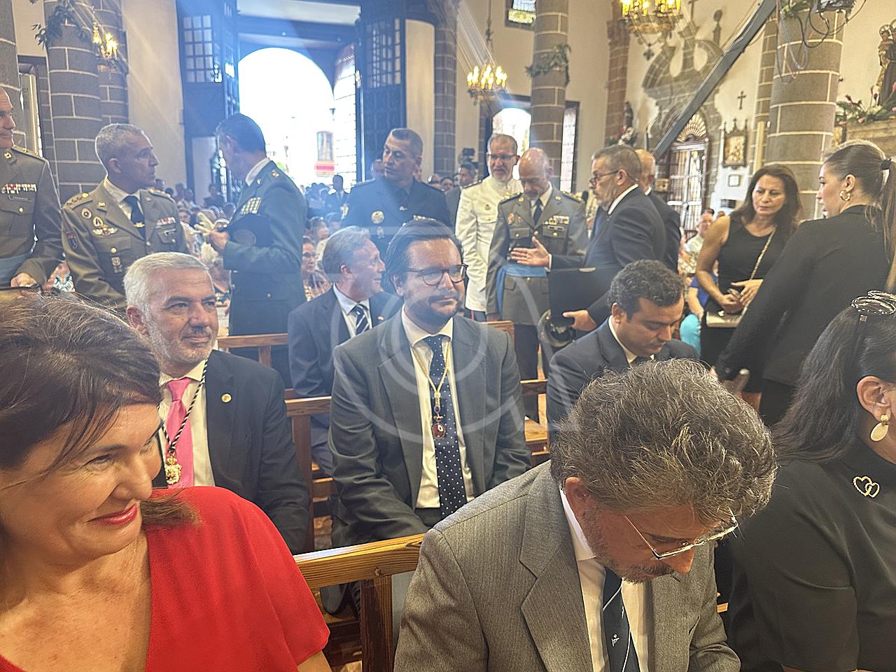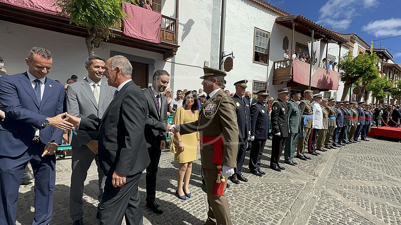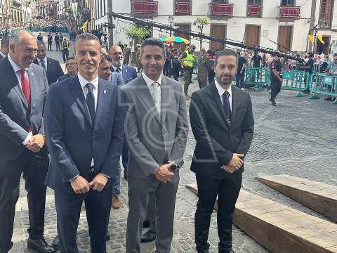 La solemne misa oficiada por el obispo de la Diócesis, Monseñor José Mazuelos, estuvo precedida del acto oficial de recepción del representante de S.M. el rey, el presidente del Gobierno de Canarias, Fernando Clavijo, a las 11.15 horas, al que siguió el desfile militar y, posteriormente, la eucaristía a las 12.00 horas, y la procesión, que mantuvo el recorrido del pasado año pasando por las calles de Iglesia Chica, la Cal, Nueva, Isaac Domínguez y Real de la Plaza.
