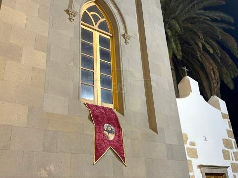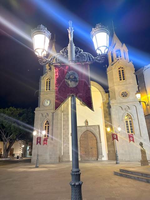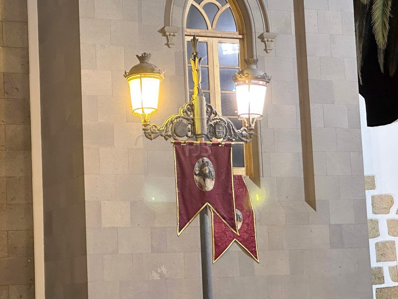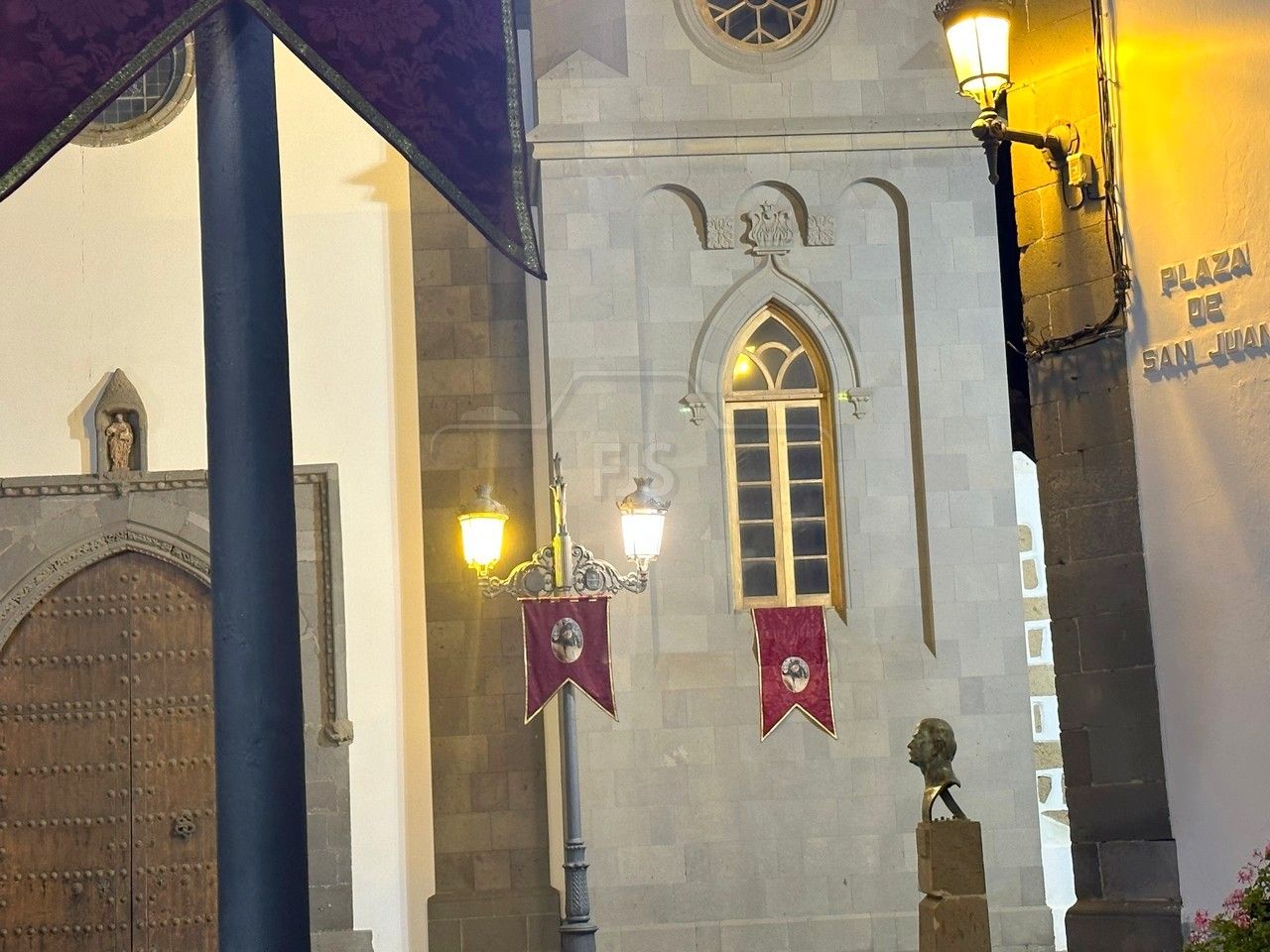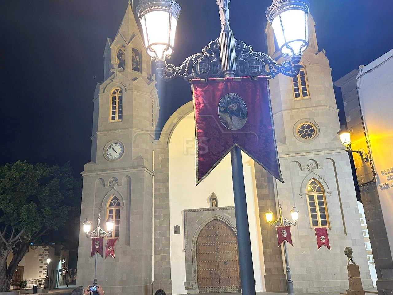 Telde no puede disimular que no está en fiestas. Los faldones, que han sido instalados por la propia Parroquia de San Juan mediante sus colaboradores y voluntarios, transmiten a la ciudadanía teldense y a sus visitantes que la ciudad celebra la bajada del Santo Cristo, su posterior procesión y el 22 de septiembre su regreso a la hornacina del Altar Mayor.
